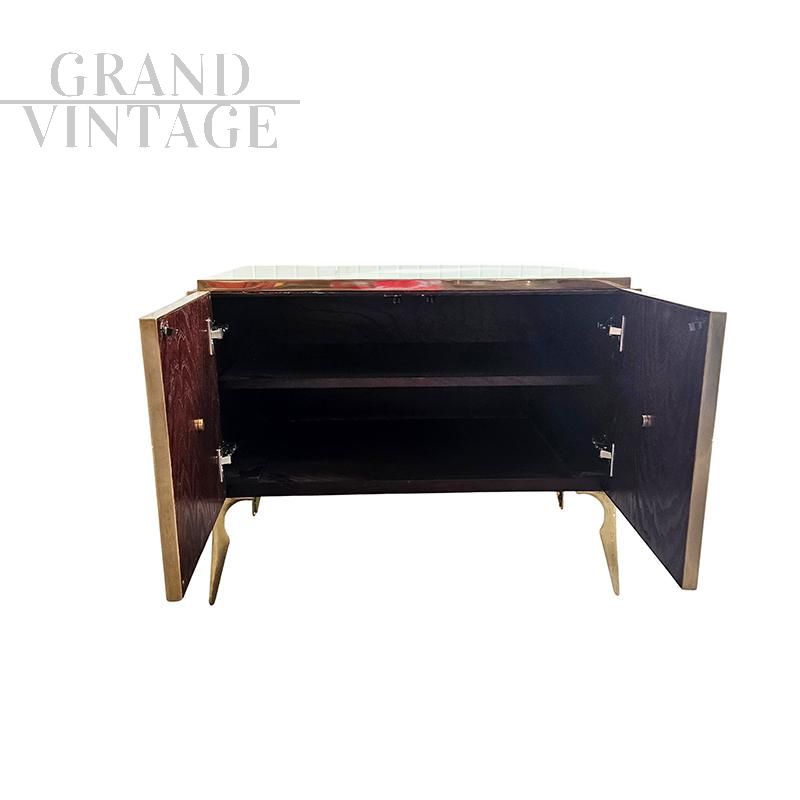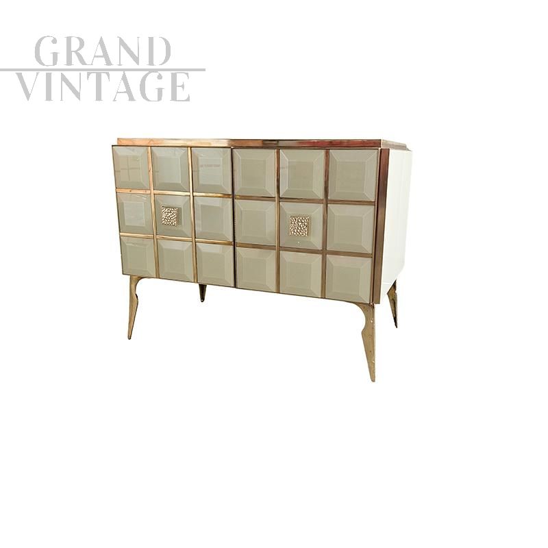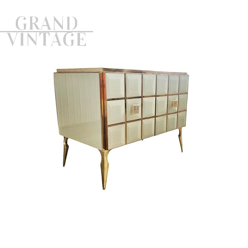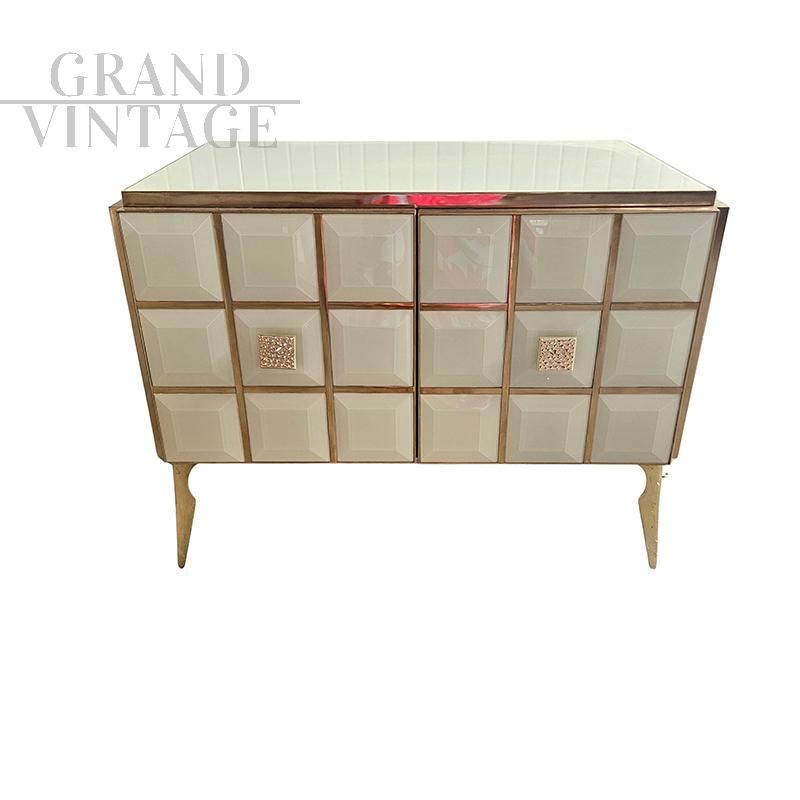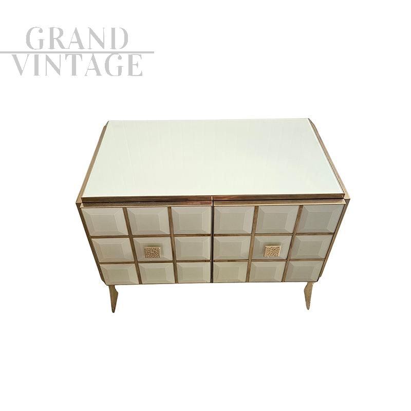 Credenza artistica a due ante interamente realizzata a mano, con struttura in legno rivestita con elementi in vetro molato color panna - avorio a simulare la struttura delle piastrelle. Ripiano interno in legno, finiture in ottone, maniglie quadrate in ottone. Disponibile anche nei colori rosa e blu.