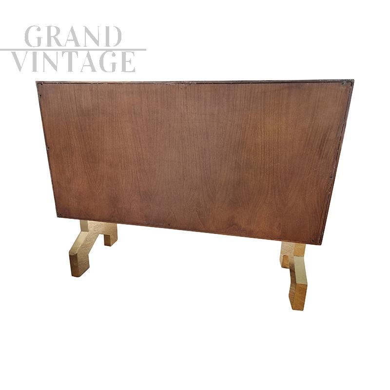 Credenza due ante con struttura in legno rivestita con pergamena color melanzana, base geometrica in acciaio dorato, arricchito con borchie e maniglie dorate.