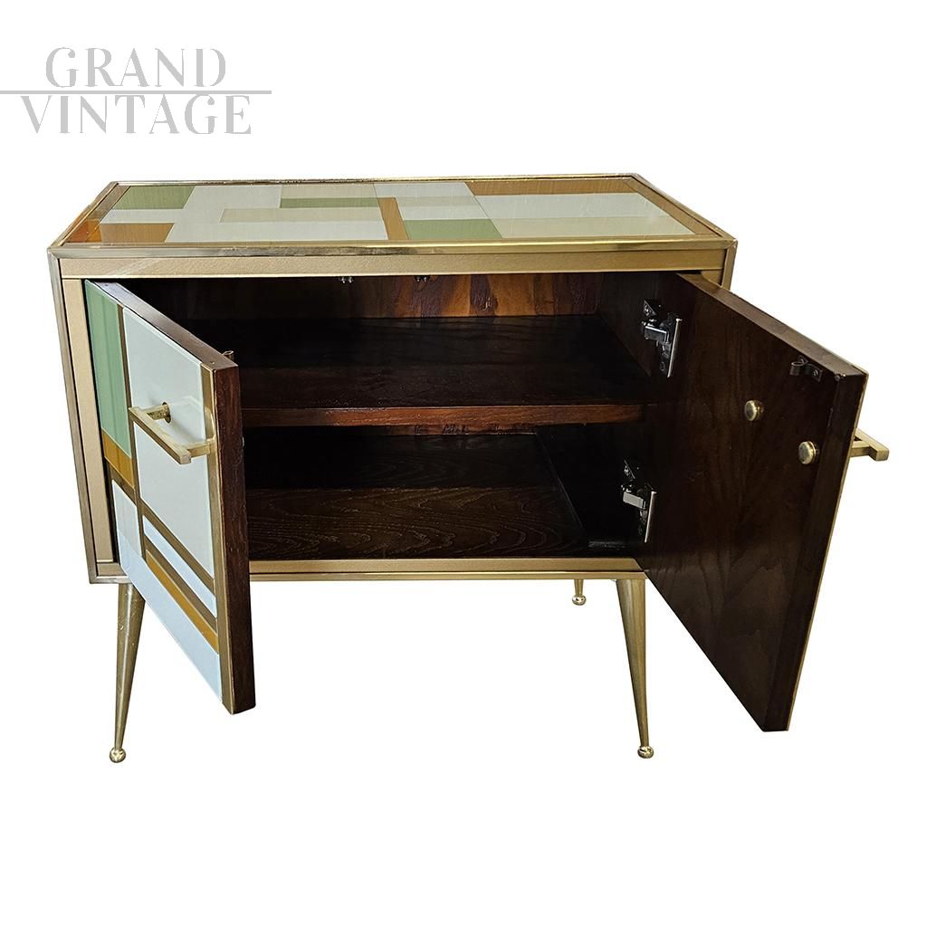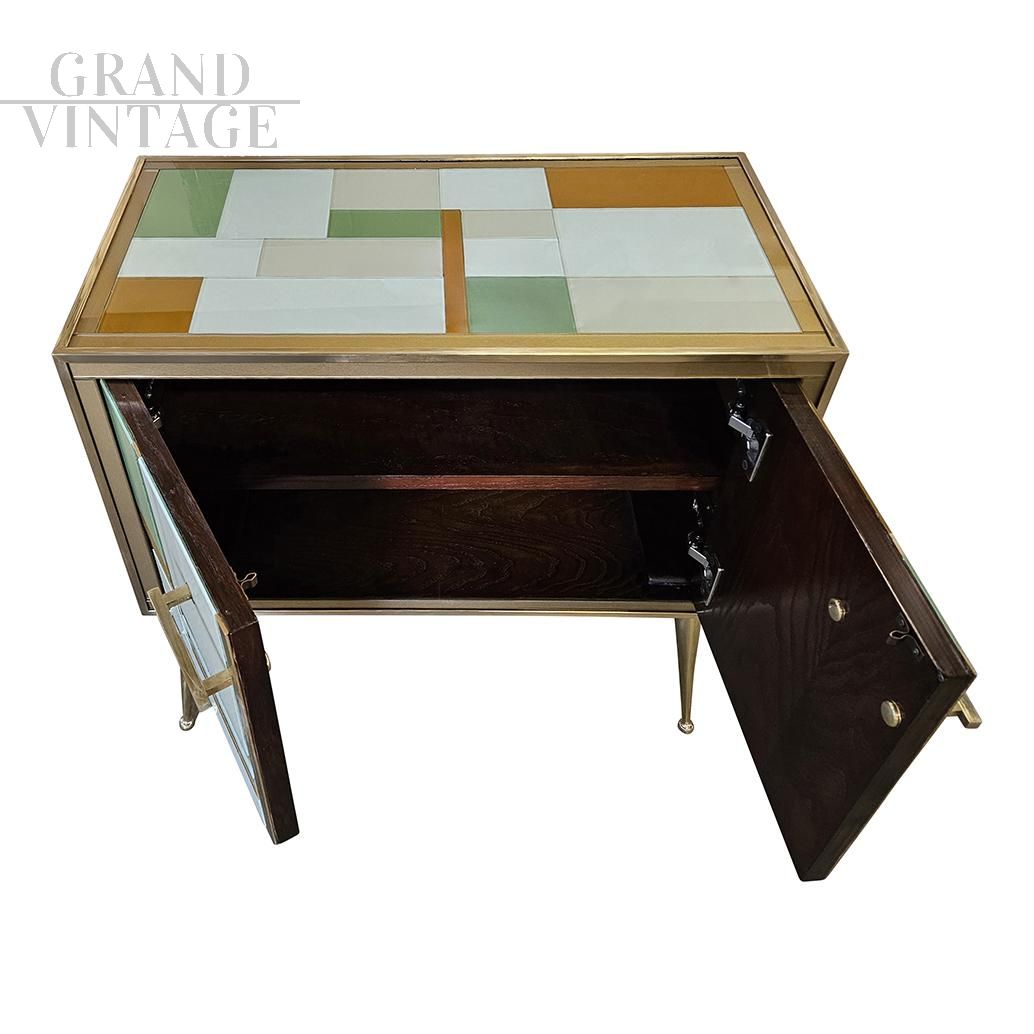 Credenza a due ante in stile vintage in vetro colorato e ottone dorato
