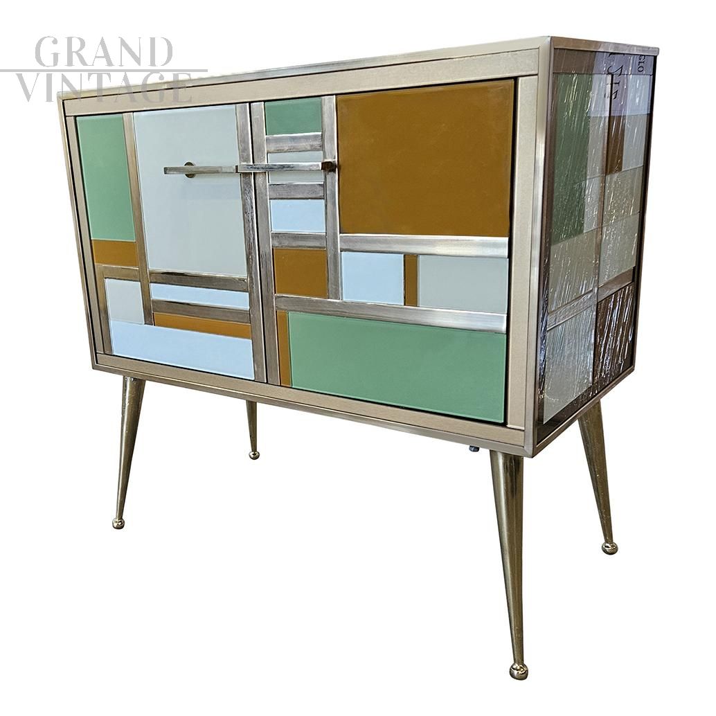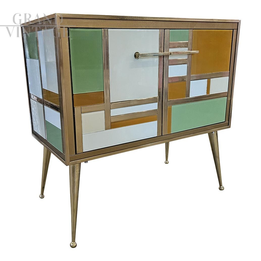 Credenza con due ante in stile vintage interamente realizzata a mano con struttura in legno rivestita in vetro di Murano colorato; arricchita con decorazioni in ottone; maniglie, profili e piedi in ottone dorato. Ripiano interno in legno.