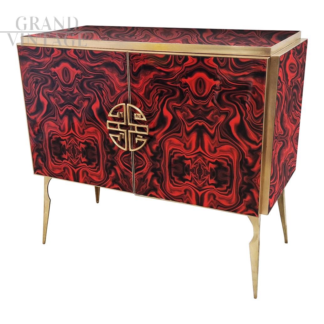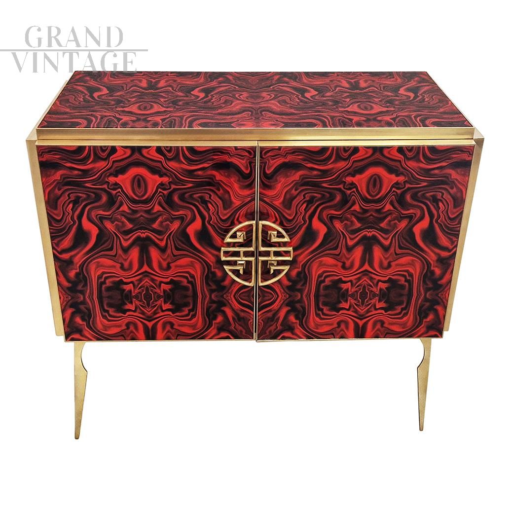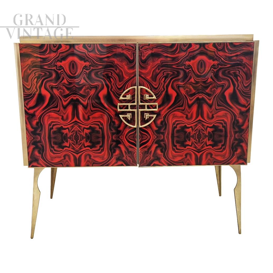 Credenza con due ante, dotata di ripiano interno in legno, interamente realizzata a mano, con struttura in legno rivestita in vetro stampato con motivo astratto rosso e nero; profili, maniglie geometriche e piedi sono in ottone dorato.