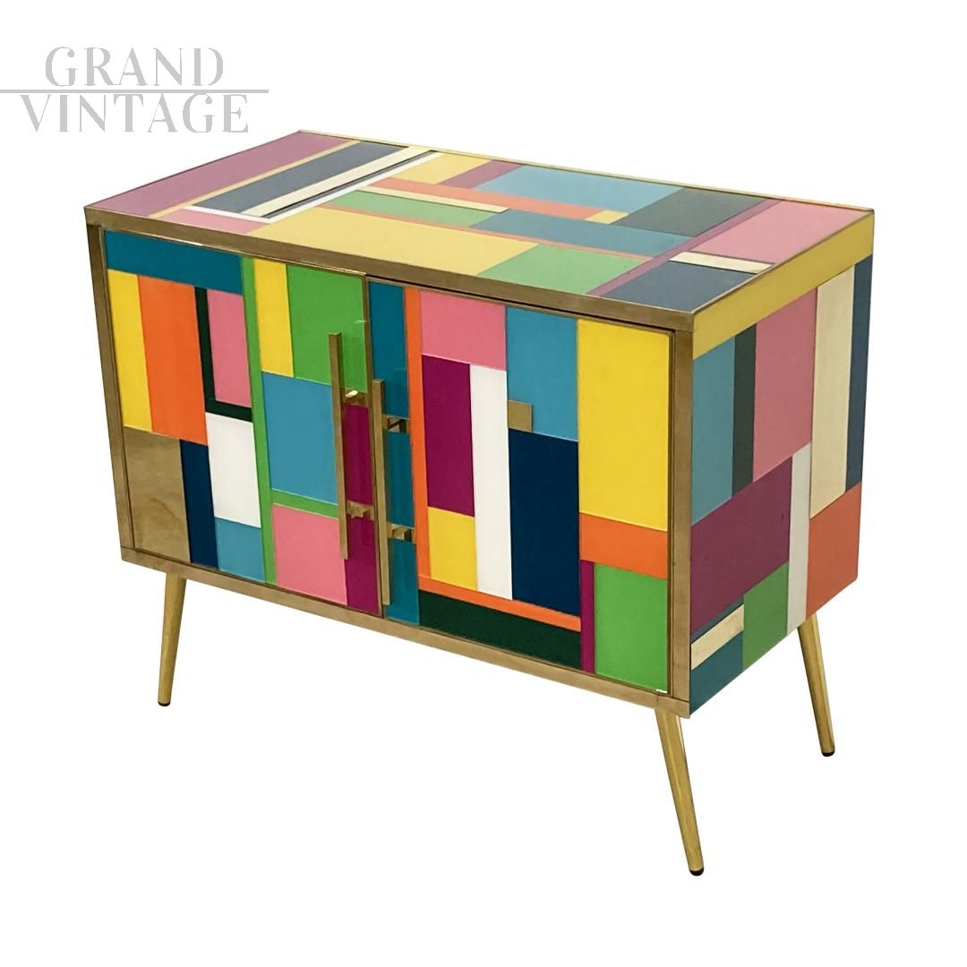 Credenza con due ante, interamente realizzata a mano, struttura in legno e finiture superficiali in vetro di Murano multicolore; profili, maniglie e piedi in ottone dorato.