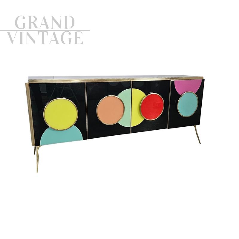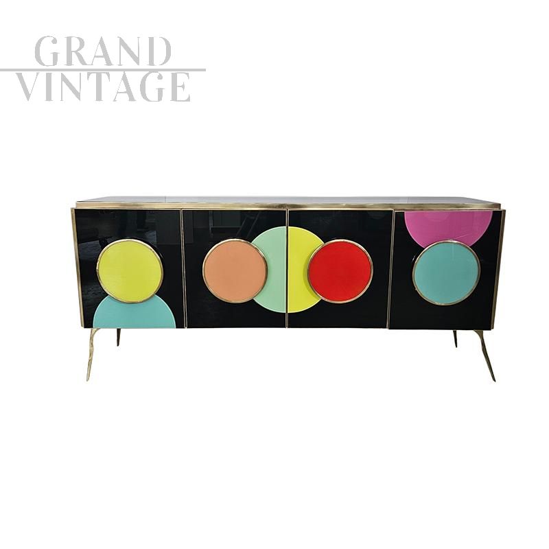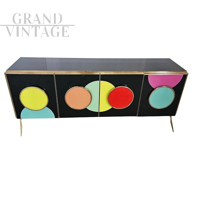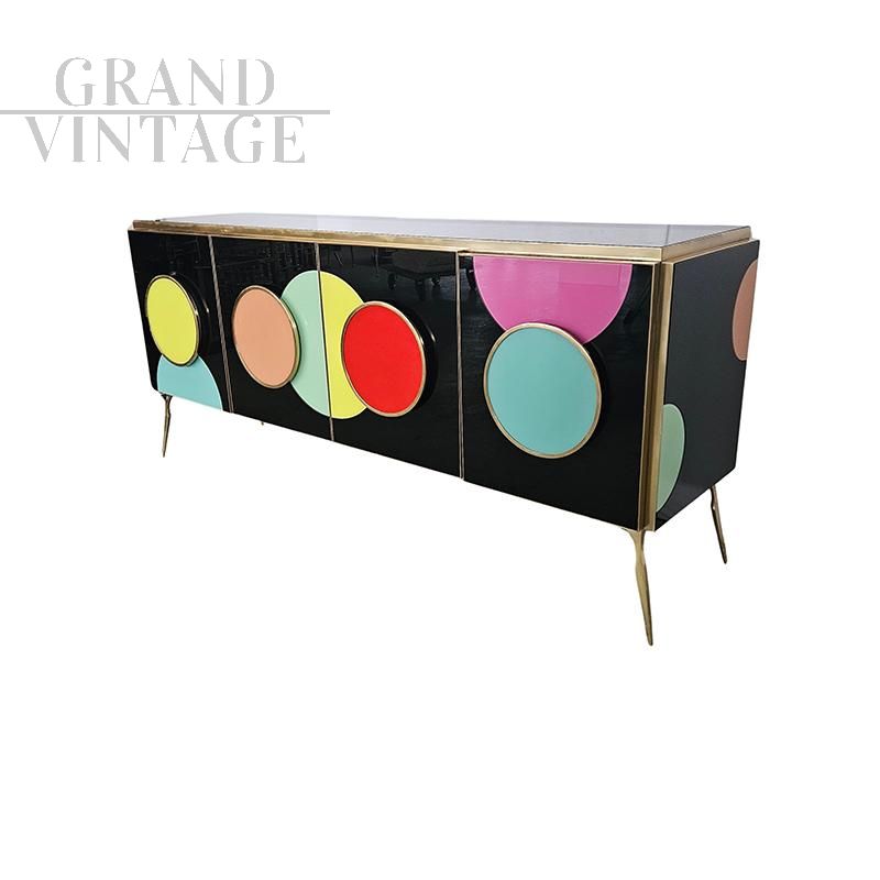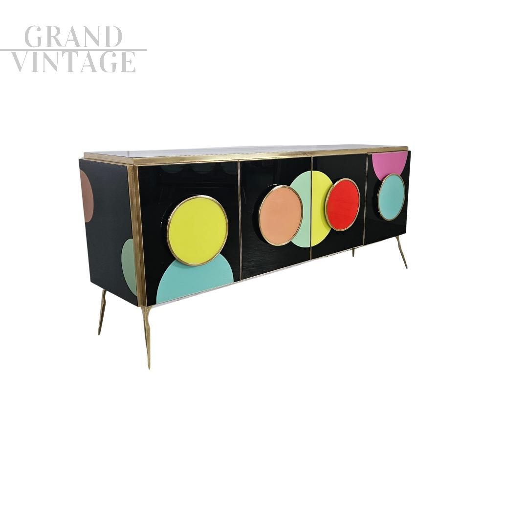 Credenza a quattro ante retroilluminata con cerchi colorati in vetro