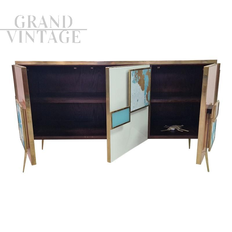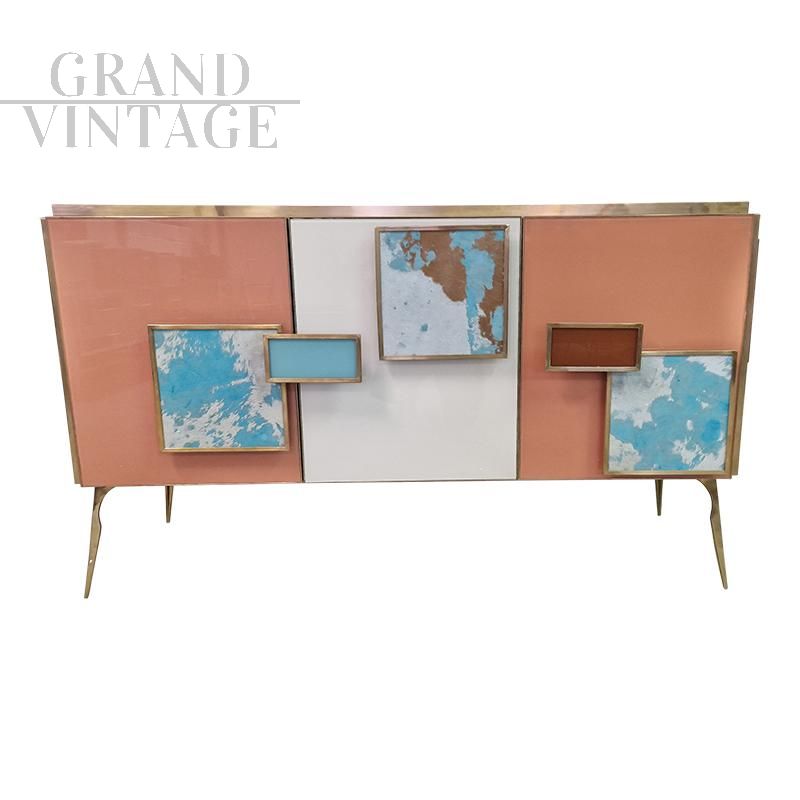 Credenza a tre ante, dotata di ripiano interno, interamente realizzata a mano, con struttura in legno ricoperta in vetro nei colori salmone e bianco; profili e piedi in ottone dorato. Maniglie in cavallino bianco e azzurro. Maniglie retro illuminate con strisce a led azionabili con apposito telecomando.