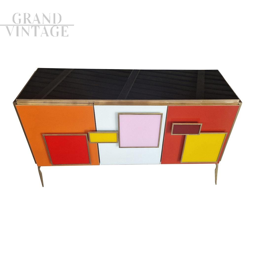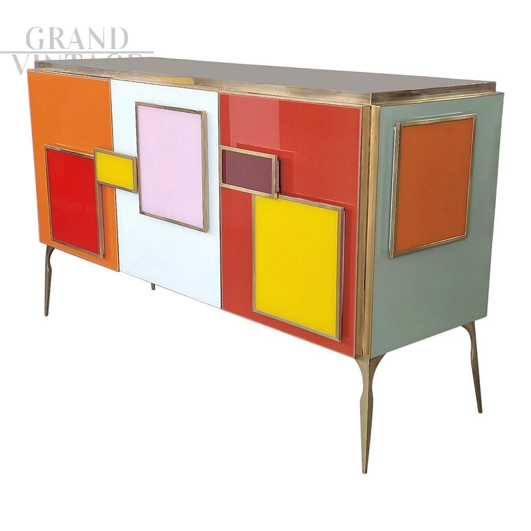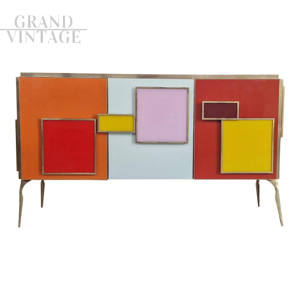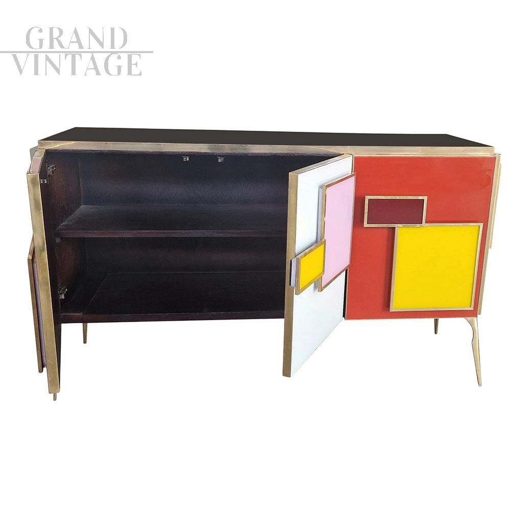 Credenza in stile vintage a tre ante, interamente realizzata a mano, con struttura in legno e finiture superficiali in vetro colorato; profili, maniglie e piedi in ottone dorato. Un ripiano interno. Maniglie retroilluminate a led.