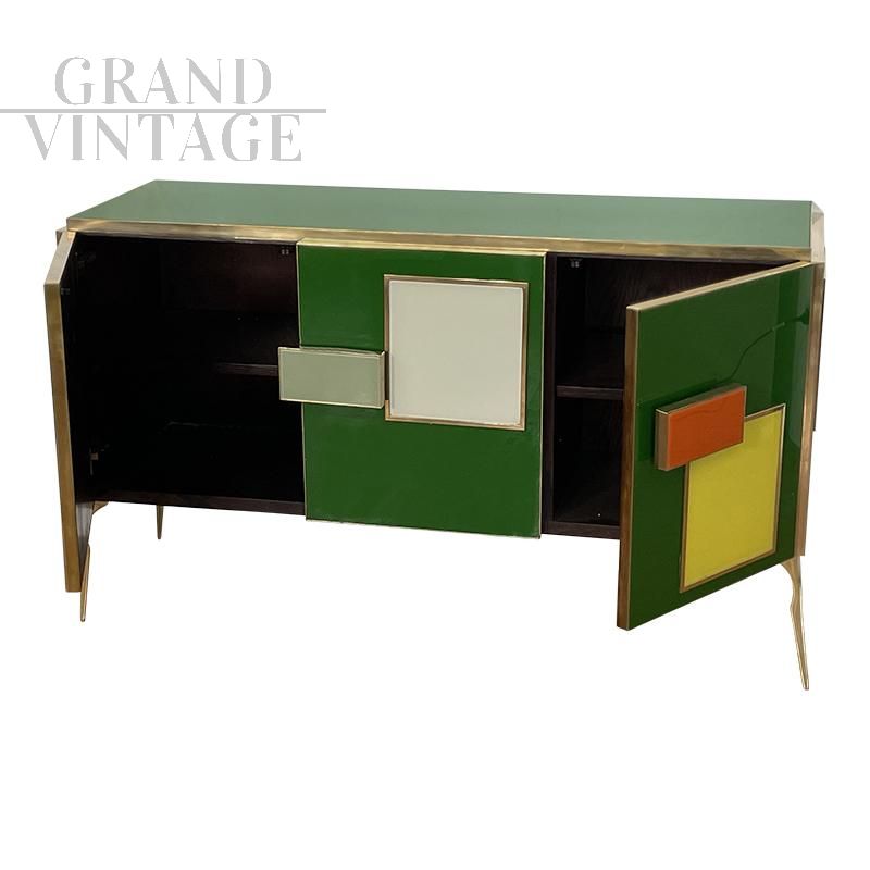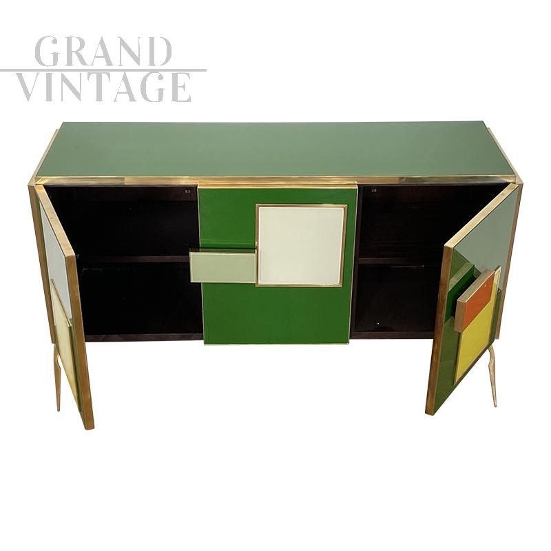 Credenza a tre ante interamente realizzata a mano, con struttura in legno e finiture superficiali in vetro verde; profili e piedi in ottone dorato, maniglie e decorazioni in vetro colorato e ottone dorato, dorata di ripiano interno.