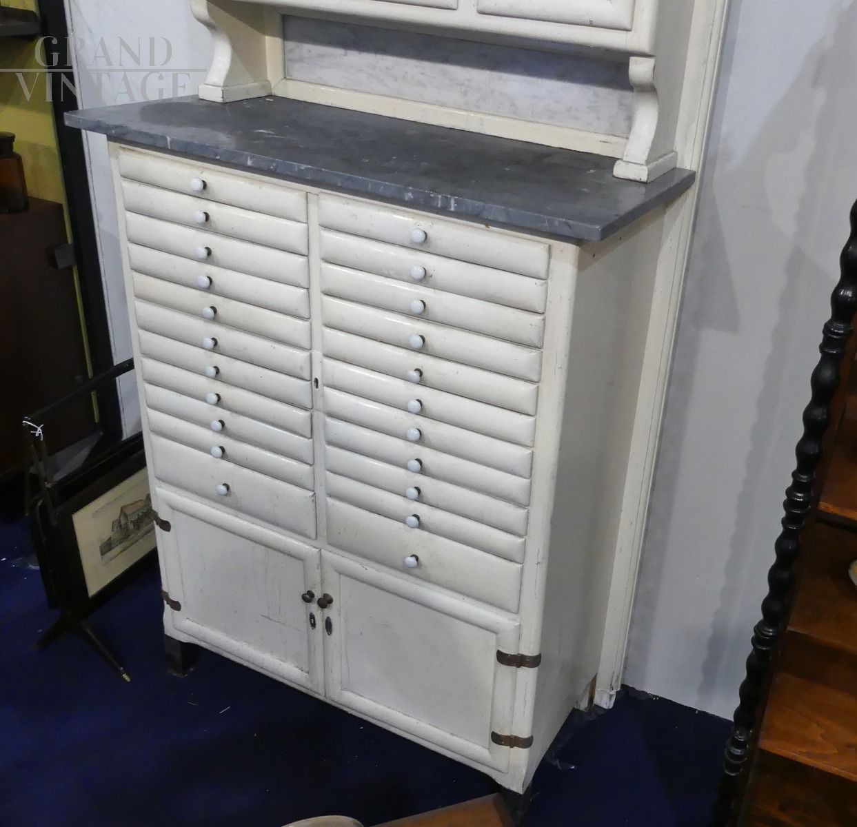 Credenza vintage a cassettini in legno bianco con piano in marmo