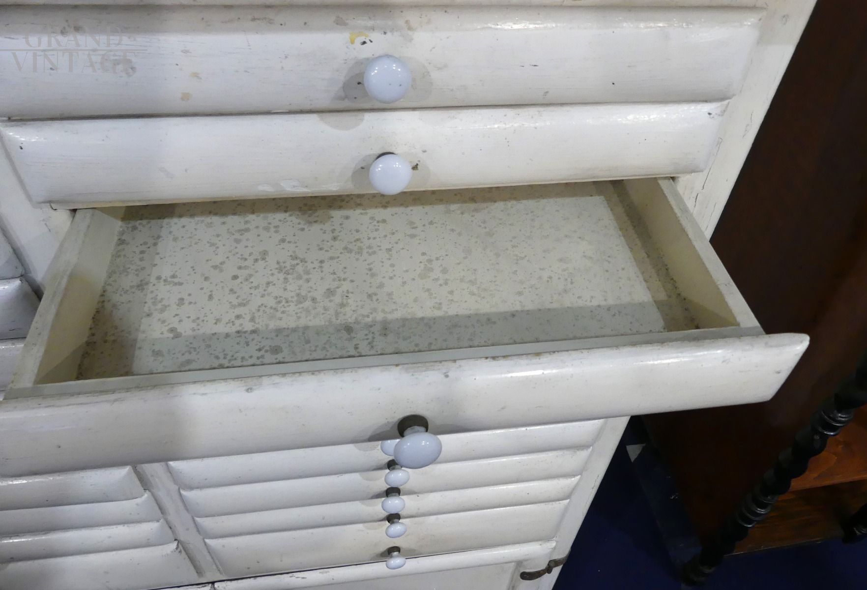 Credenza alta vintage a cassettini in legno bianco con piano in marmo
