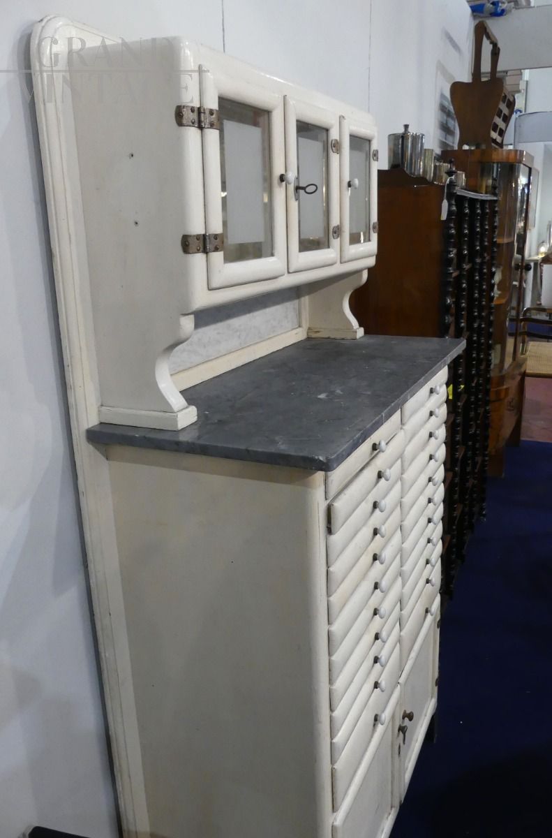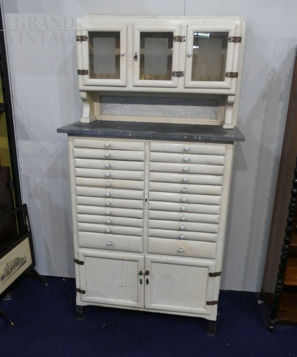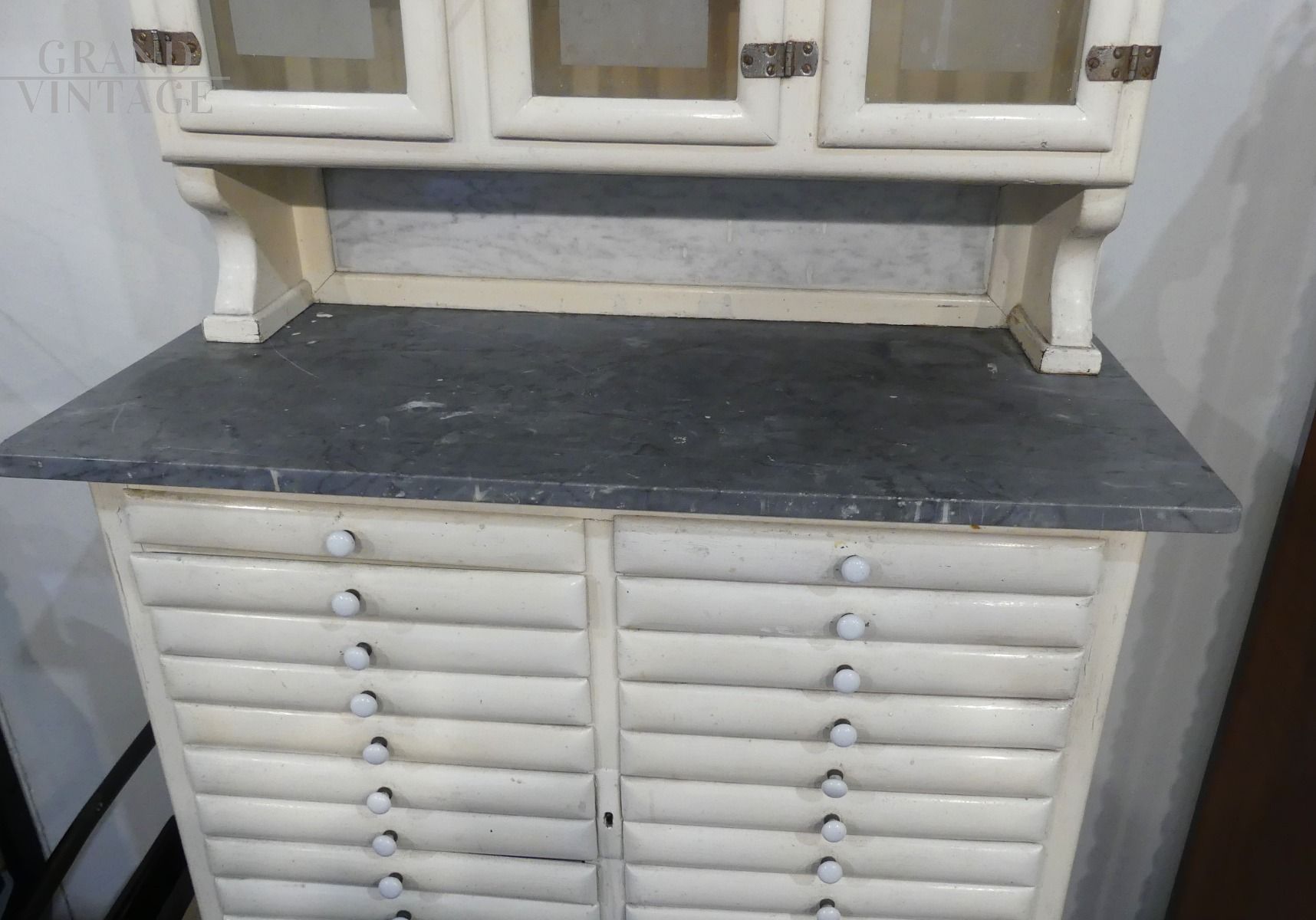 Credenza da cucina vintage a doppio corpo con cassettini nella parte superiore, piano e fondo centrale in marmo, parte superiore con ante a vetro. Originariamente utilizzata come mobile di uno studio medico, può essere utilizzata per diversi scopi. In buone condizioni, conserva ancora i vetri originali e le cerniere coeve, presenta i naturali segni del tempo.