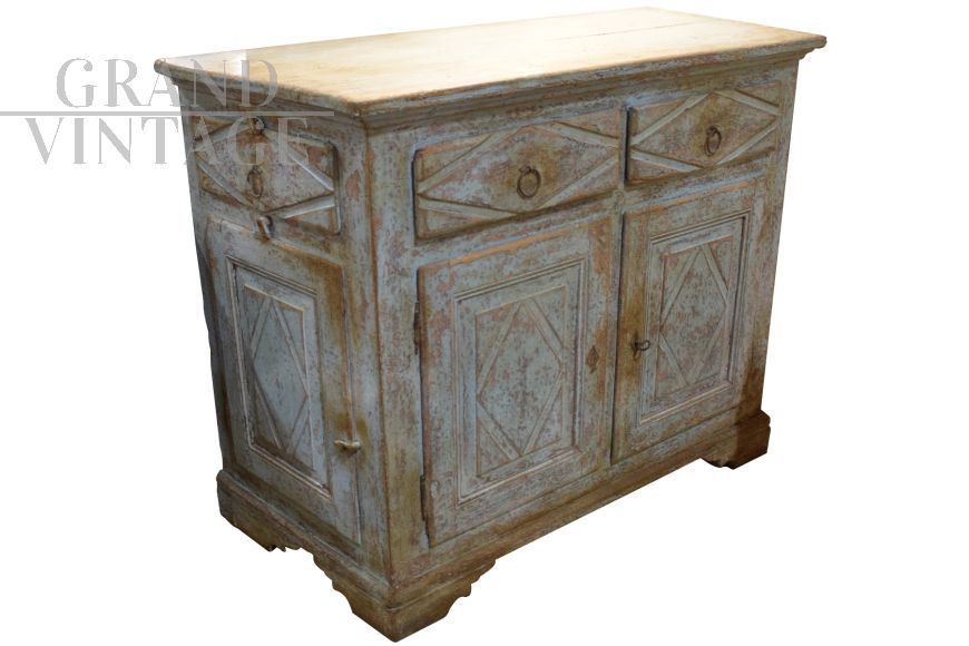 Credenza alto Veneto del 1700 in legno di abete laccato azzurro/blu.