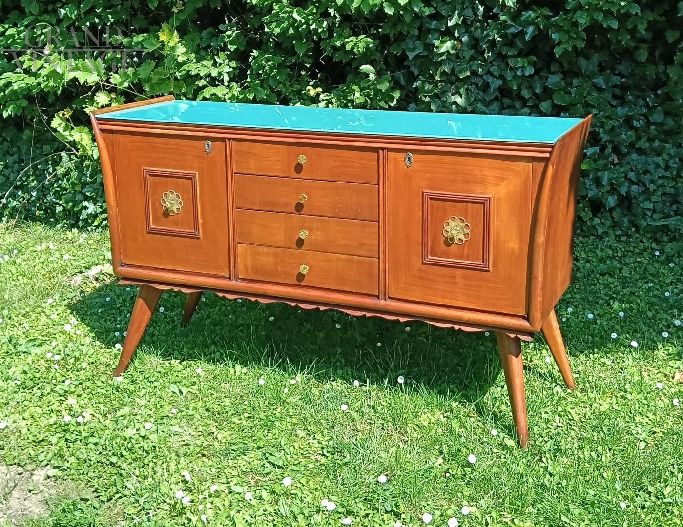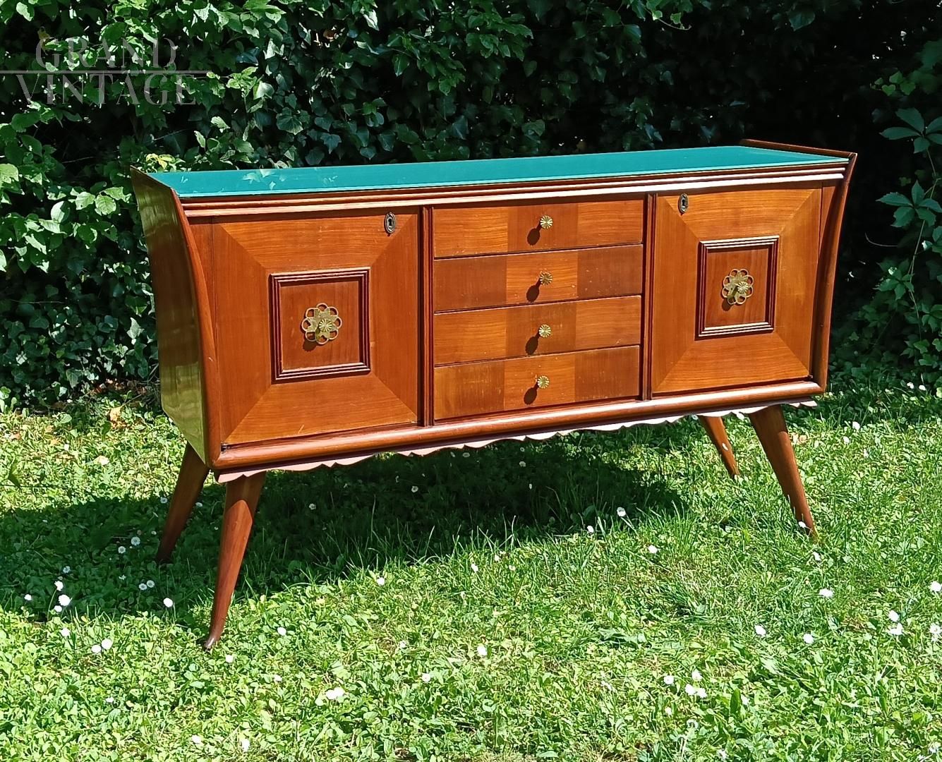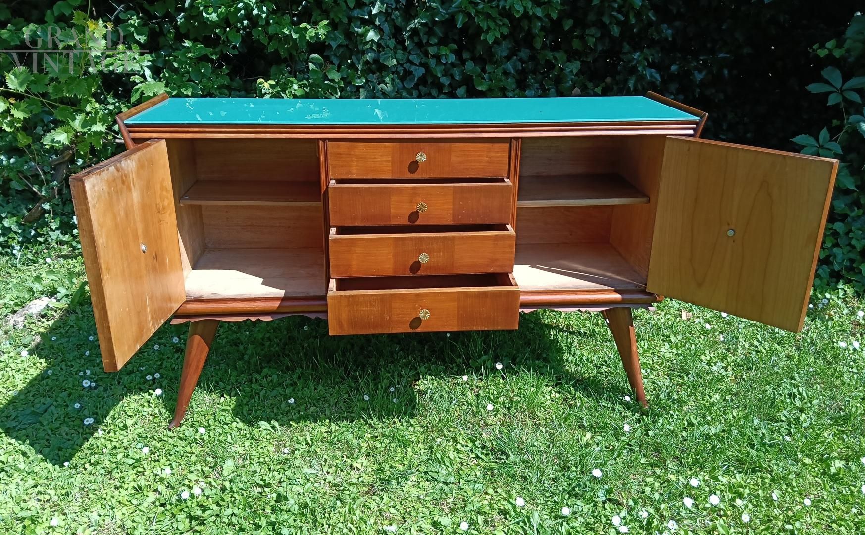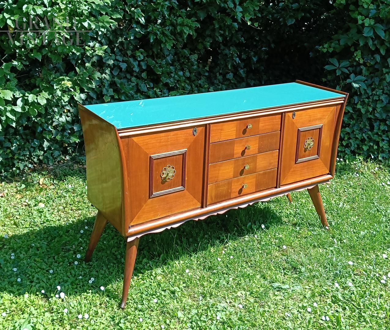 Credenza italiana anni '50 con disegno geometrico ed esecuzione degli intagli molto curati e dettagliati. La struttura è in legno di olmo tamburato, il piano in vetro retro laccato azzurro - verde. I piedi sono in legno massiccio, e son sormontati de festoni decorativi sotto la base. I fianchi sono finemente svasati. La credenza è in ottimo stato, è stata smontata e restaurata, non ha difetti evidenti ma porta qualche naturale segno d'uso. Maniglie in ottone massiccio, la chiave è mancante, la chiusura delle ante è a calamita.