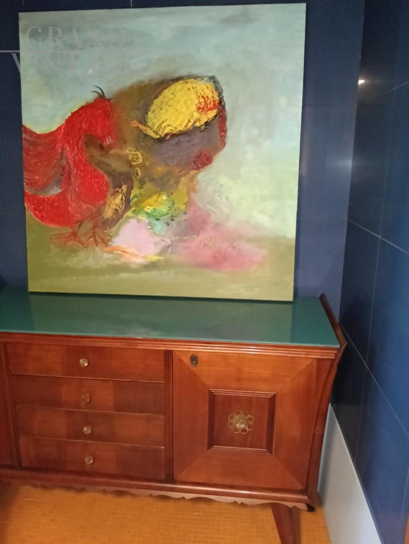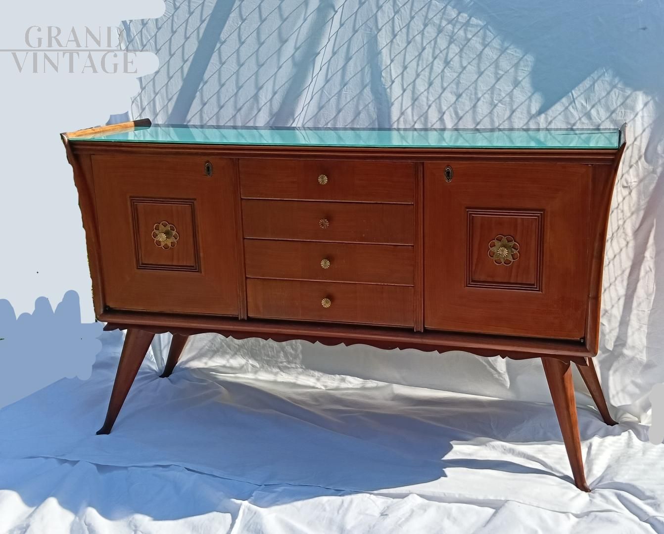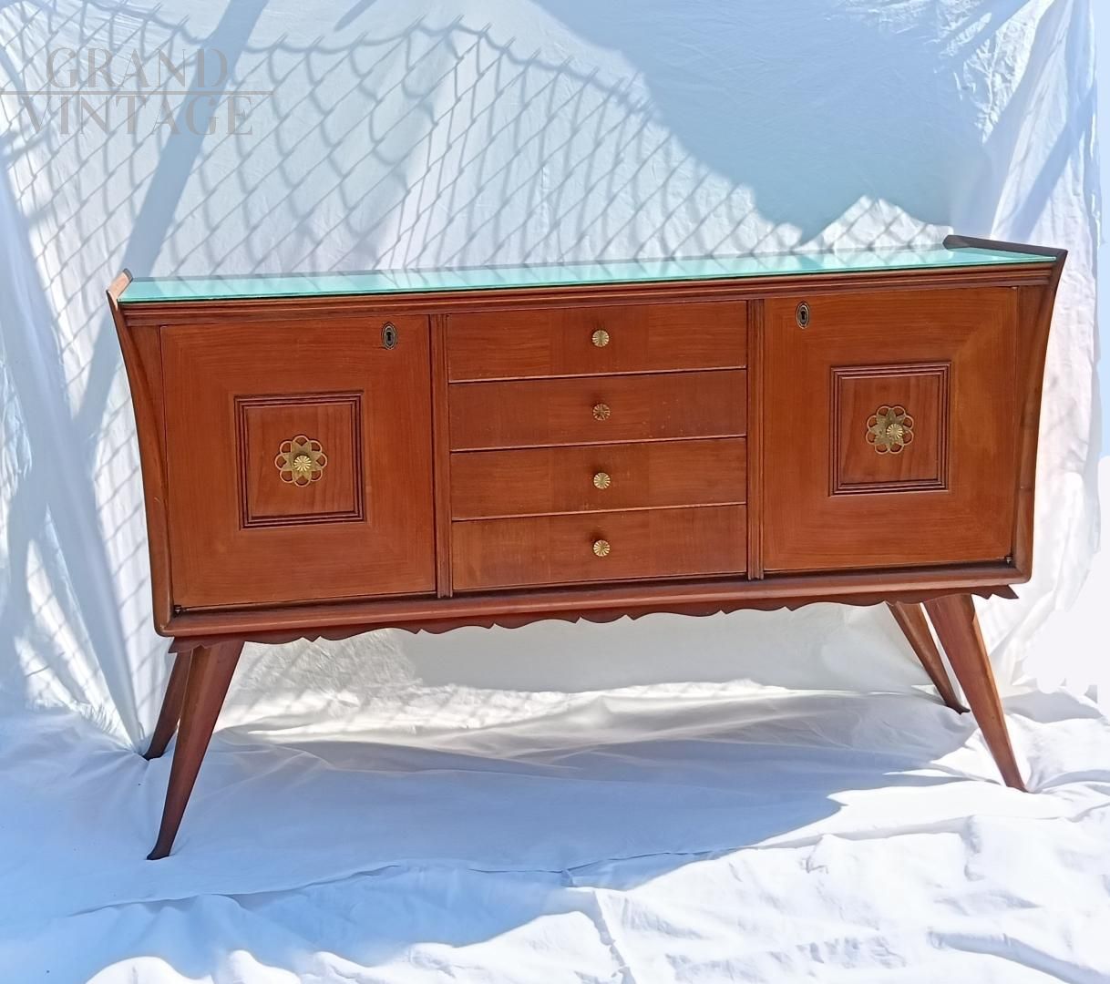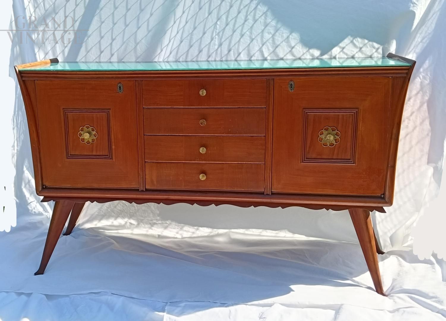 Credenza italiana anni '50 con disegno geometrico ed esecuzione degli intagli molto curati e dettagliati. La struttura è in legno di olmo tamburato, il piano in vetro retro laccato azzurro - verde. I piedi sono in legno massiccio, e son sormontati de festoni decorativi sotto la base. I fianchi sono finemente svasati. La credenza è in ottimo stato, è stata smontata e restaurata, non ha difetti evidenti ma porta qualche naturale segno d'uso. Maniglie in ottone massiccio, la chiave è mancante, la chiusura delle ante è a calamita.