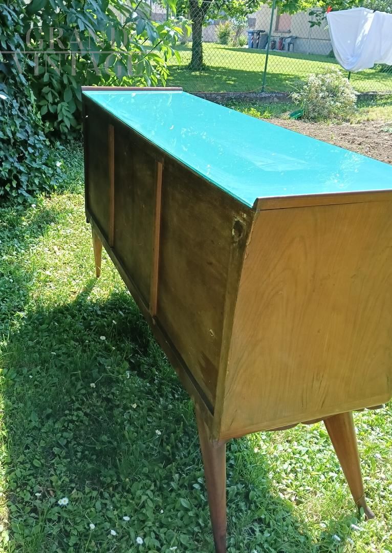 Credenza anni '50 con piano in vetro azzurro