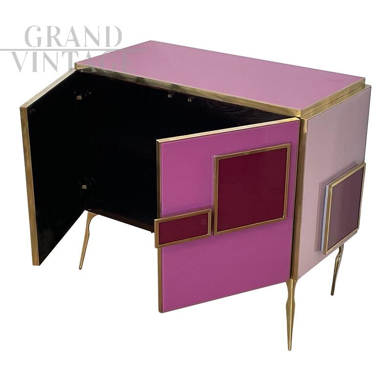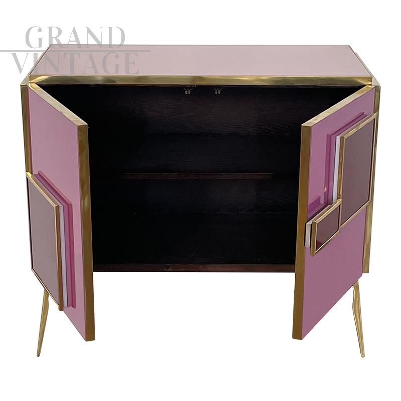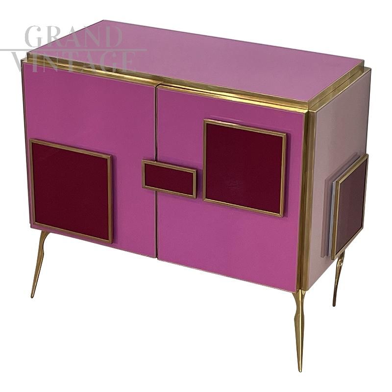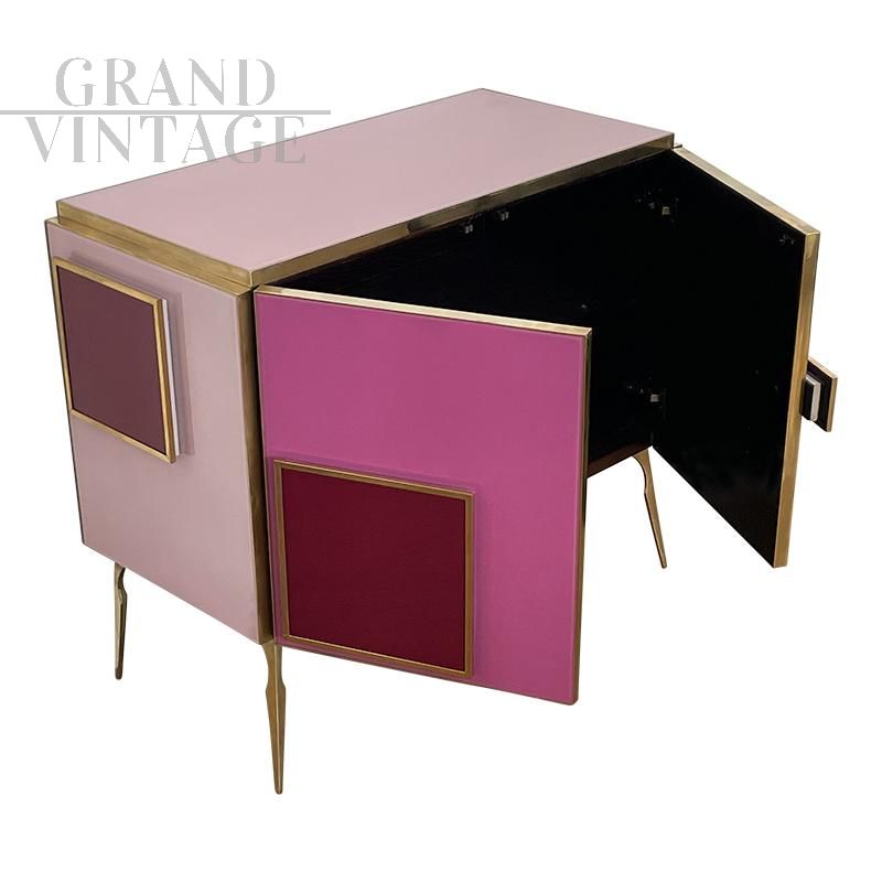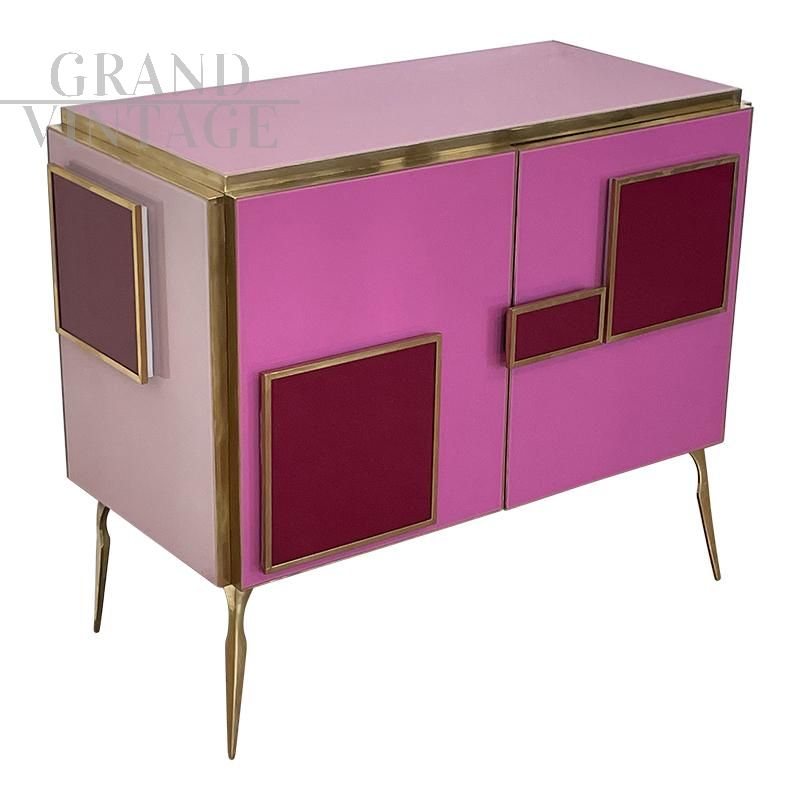 Credenza design anni '80 con due ante interamente realizzata a mano, con struttura in legno e finiture superficiali in vetro di Murano su gradazioni del rosa fucsia e rosso; un ripiano interno, profili, maniglie e piedi in ottone dorato. Maniglie con illuminazione a led.