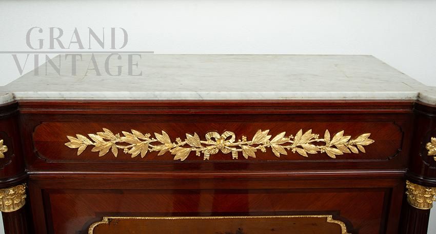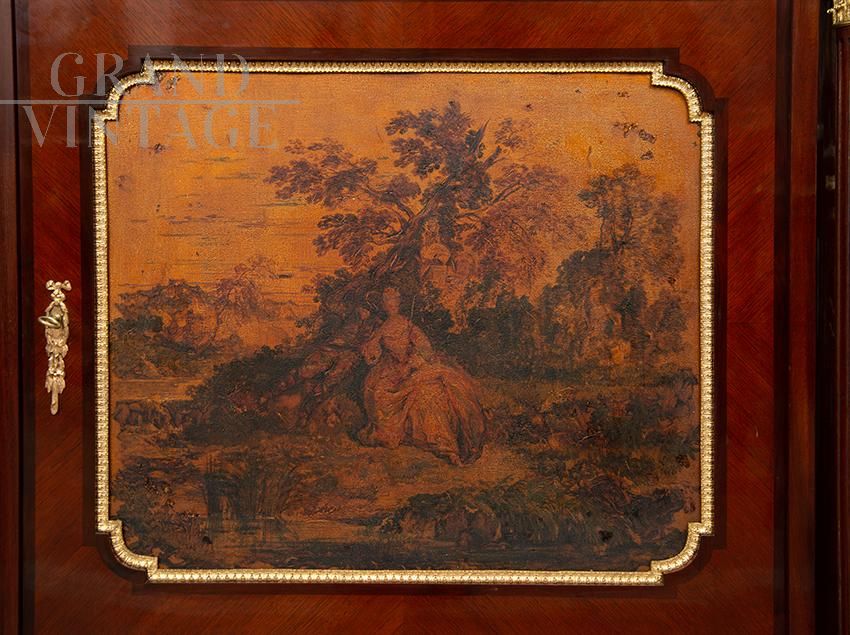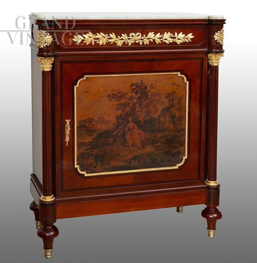 Credenza antica Napoleone III Francese della seconda metà dell’800 alla maniera di Vernis Martin. Il fronte è caratterizzato da un'anta a battente con al centro un dipinto raffigurante scena galante, ad impreziosire i laterali vi sono due colonne scanalate terminanti con capitelli corinzi in bronzo dorato. Il piano ad incasso è in marmo bianco statuario, la chiave è originale dell’epoca. La fascia sottopiano è adornata con una guarnitura in bronzo dorato con al centro una nocchetta Maria Antonietta.