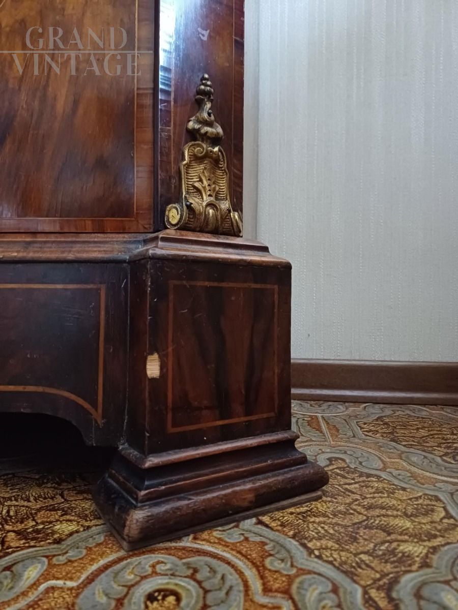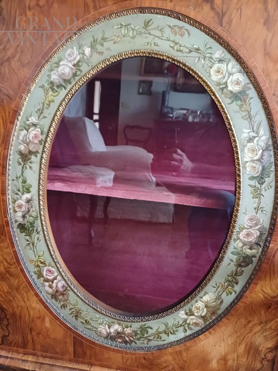 Credenza antica vittoriana a due ante in radica di noce, della seconda metà del XIX secolo, composta da due grandi ante con vetrate ovali incorniciate da una raffinata decorazione floreale dipinta a mano su fondo verde salvia, valorizzate da cornici dorate a rilievo. Fregi in bronzo dorato cesellato lungo i lati e la cimasa superiore. Interno rivestito in velluto porpora, a due livelli e quattro cassetti. Serratura originale a chiave funzionante.