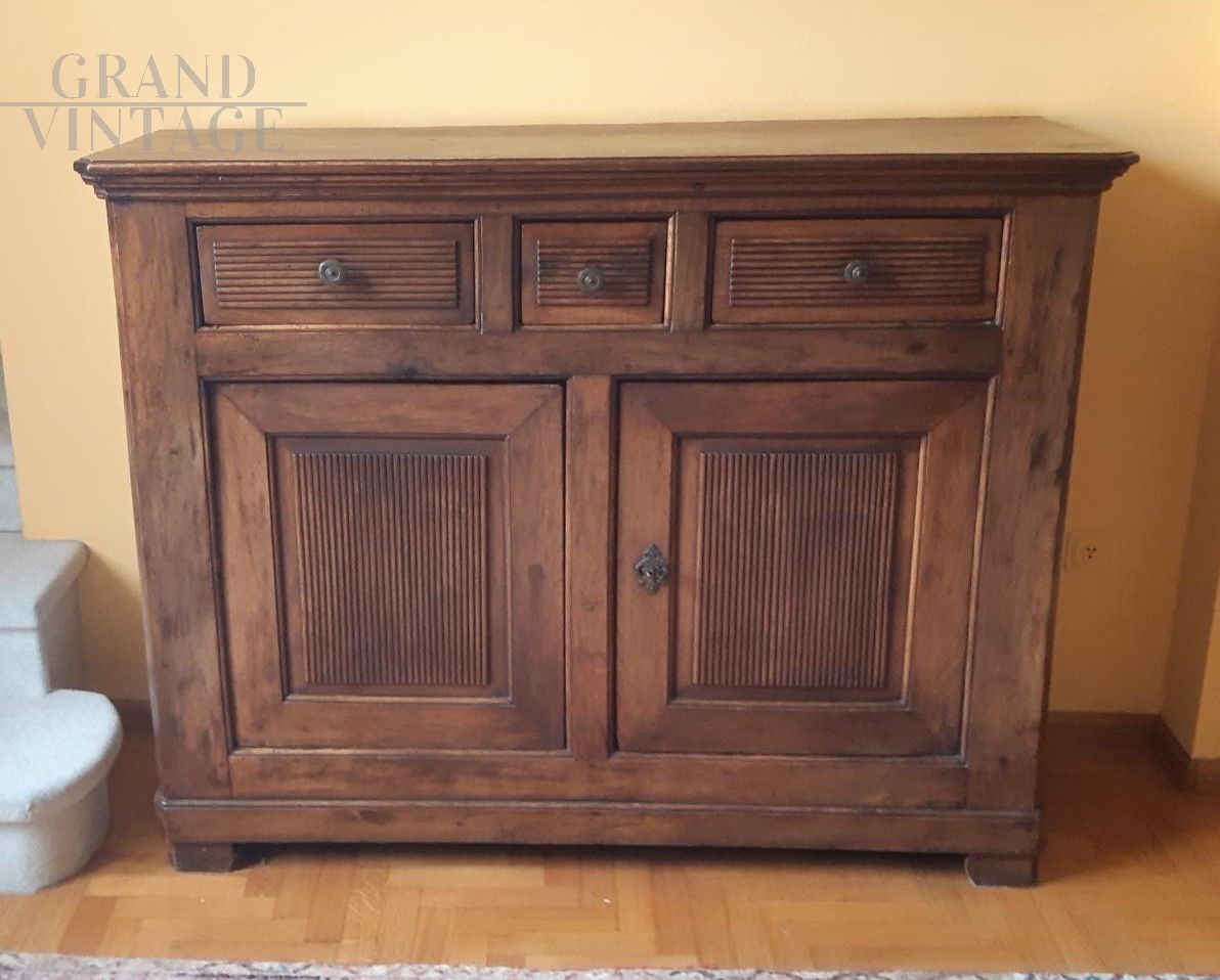 Credenza antica del XIX secolo in noce finemente scanalato, composta da due ante e tre cassetti, internamente rivestita di carta. E' perfettamente restaurata e non necessita di ulteriori interventi. Presenta un particolare motivo sulle ante, sui cassetti e sui fianchi che la rende unica nel suo genere. Scopri l'eleganza con la nostra credenza antica in noce, un capolavoro della fine del XIX secolo. Questo buffet è caratterizzato da ante e cassetti sapientemente realizzati, che offrono funzionalità e bellezza senza tempo. Ideale per le sale da pranzo, mette in mostra il fascino vintage e l'artigianato superiore, rendendolo una preziosa aggiunta a qualsiasi collezione di mobili di pregio.