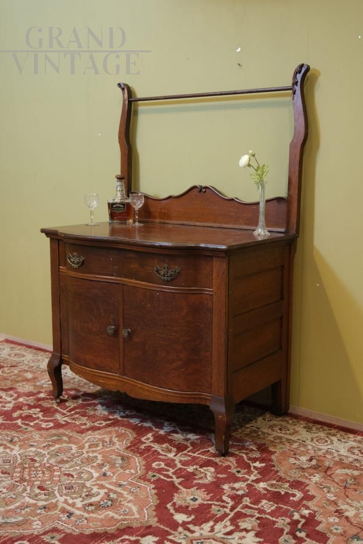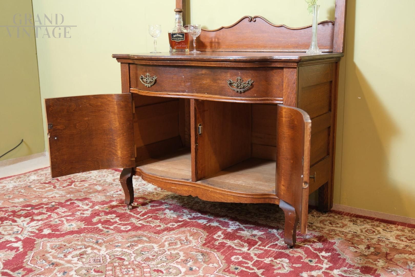 Eleganza sobria e funzionalità si incontrano in questo mobile d’epoca, una credenza in stile antico con belle forme mosse e intagli delicati, ideale per arredare con stile e ordine ogni angolo della casa o del locale.