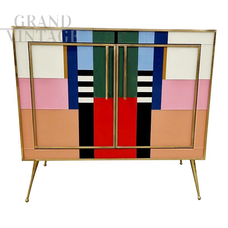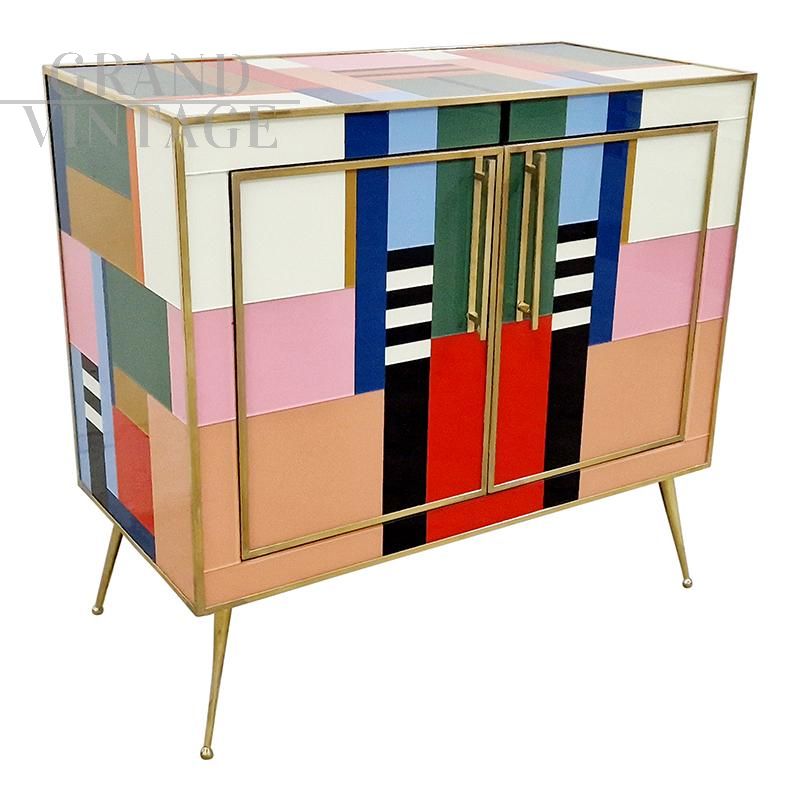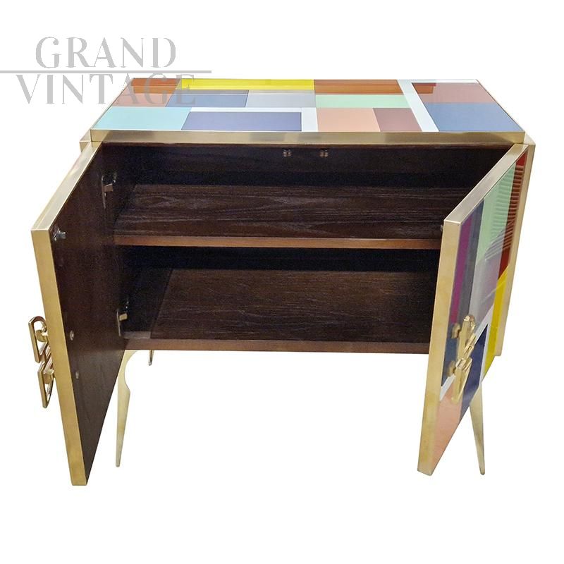 Piccola credenza a due ante con ripiano interno, interamente realizzata a mano, con struttura in legno rivestita in vetro colorato. Profili, maniglie e piedi in ottone dorato.
