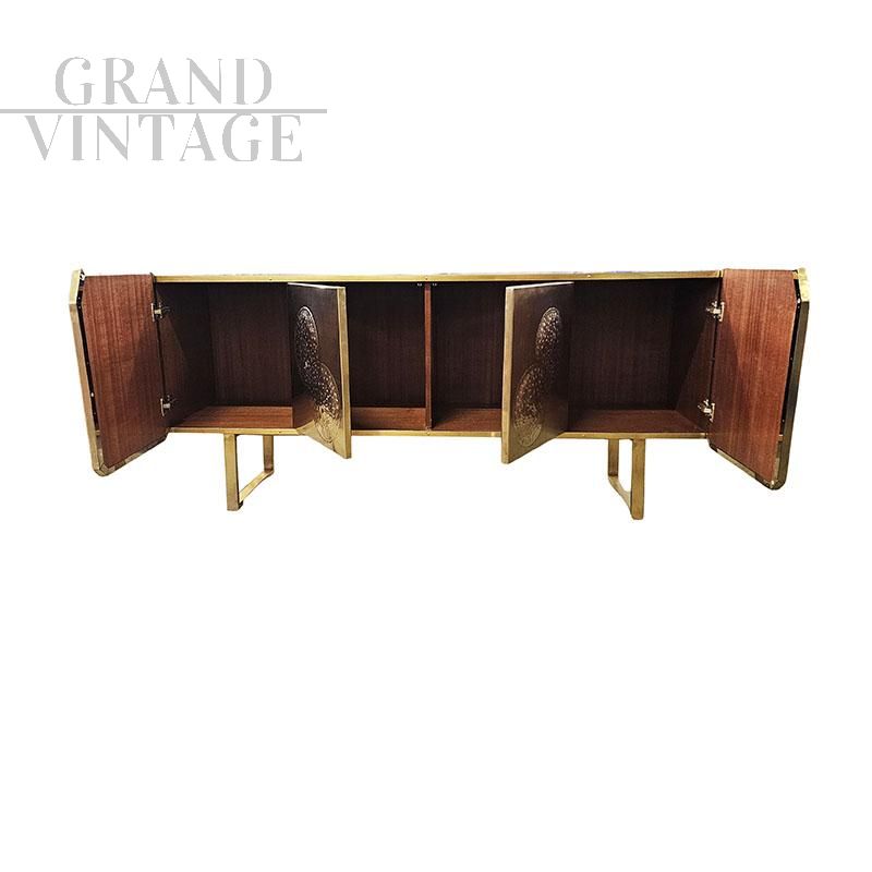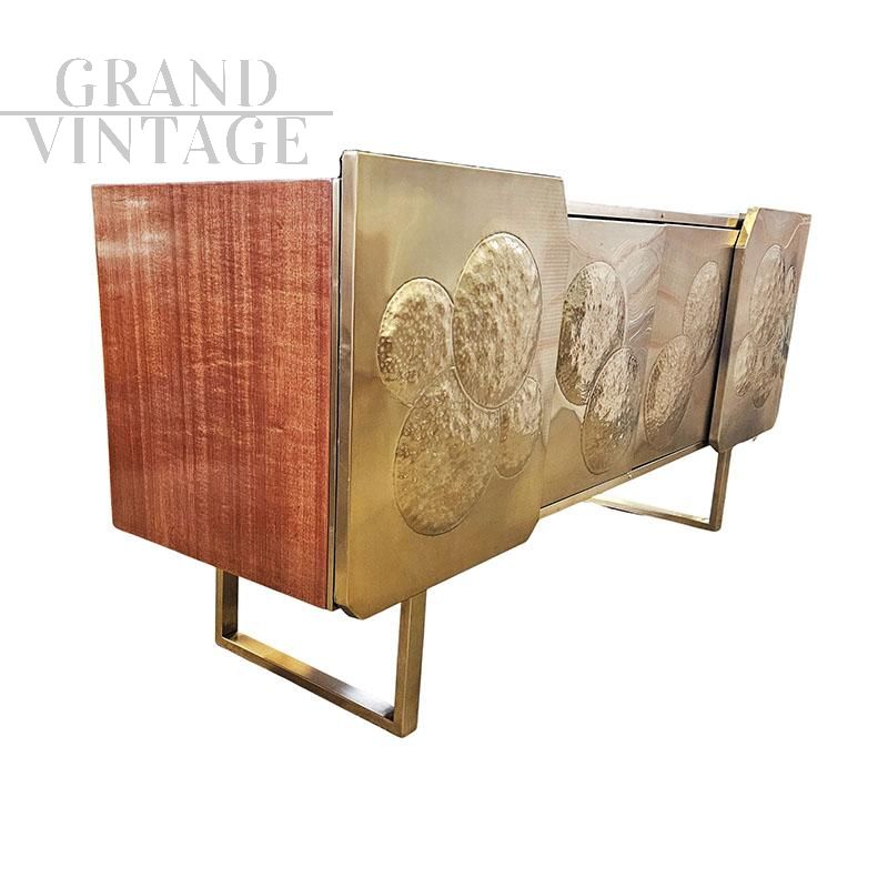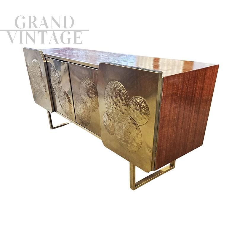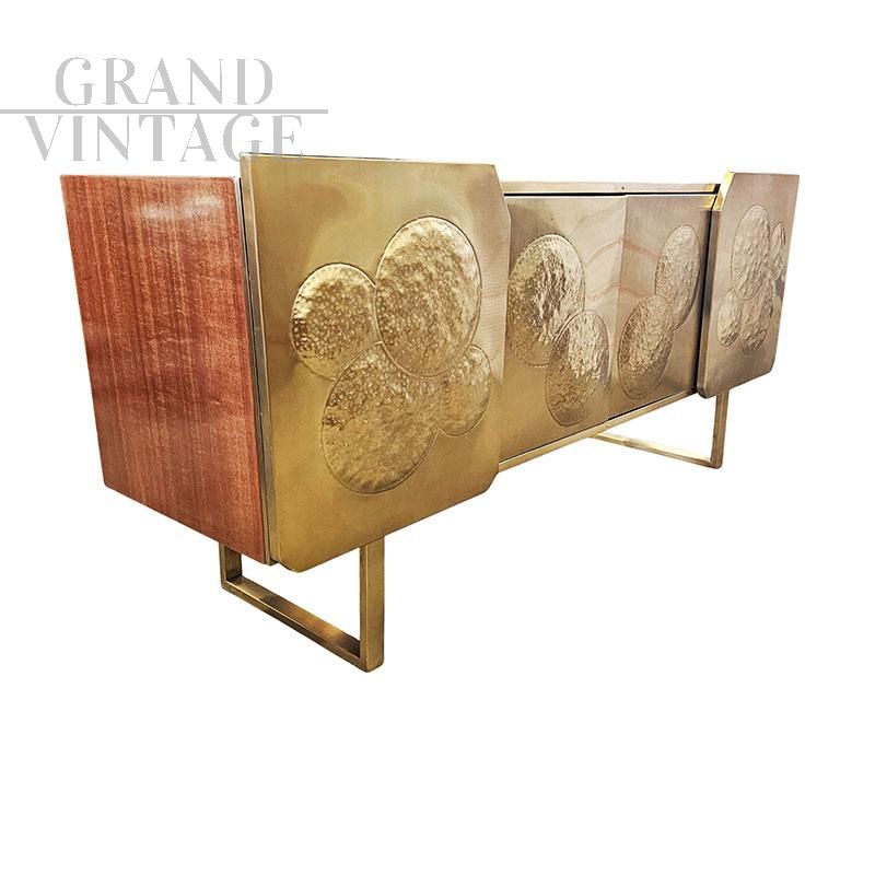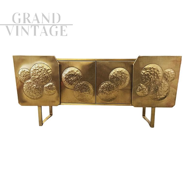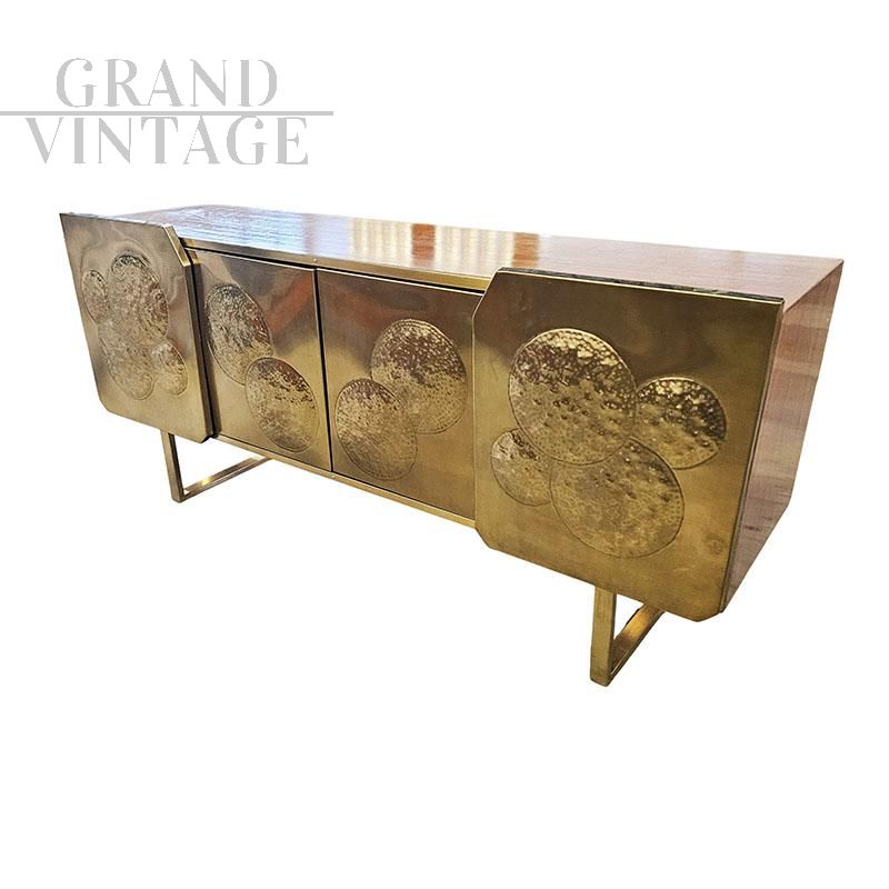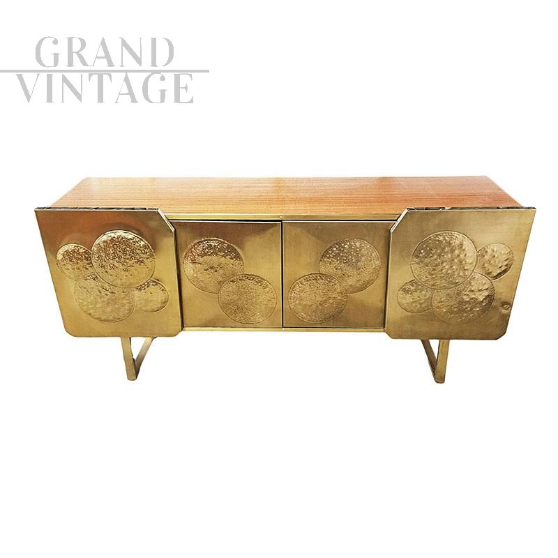 Credenza realizzata a mano, con struttura in legno, ricoperta da ottone e base in tubolare di ottone. Le ante sono arricchite da inserti a cerchio in ottone martellato.