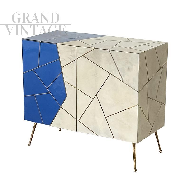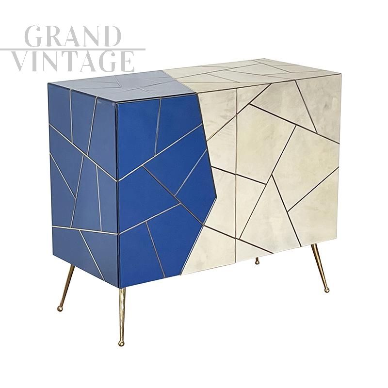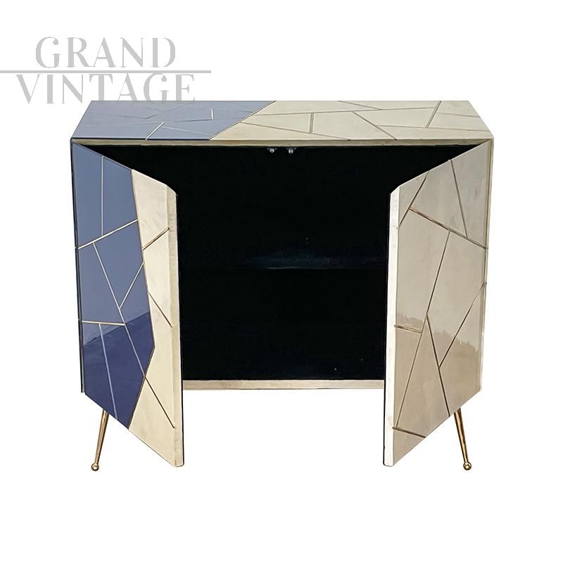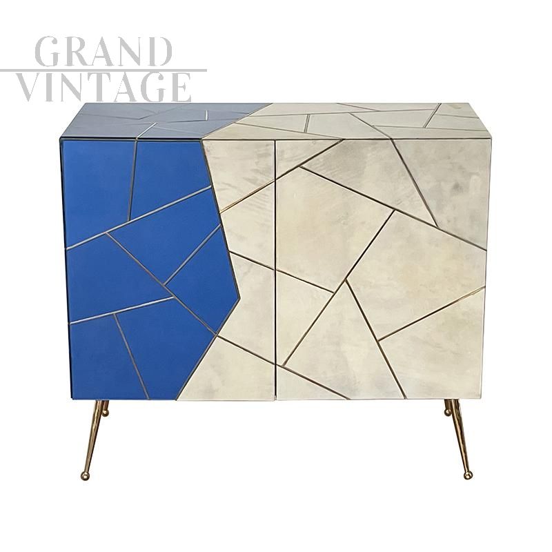 Credenza design in legno rivestita in vetro color pergamena naturale e azzurro, caratterizzata da due ante con apertura push pull con ripiano interno, profili e piedi in ottone.