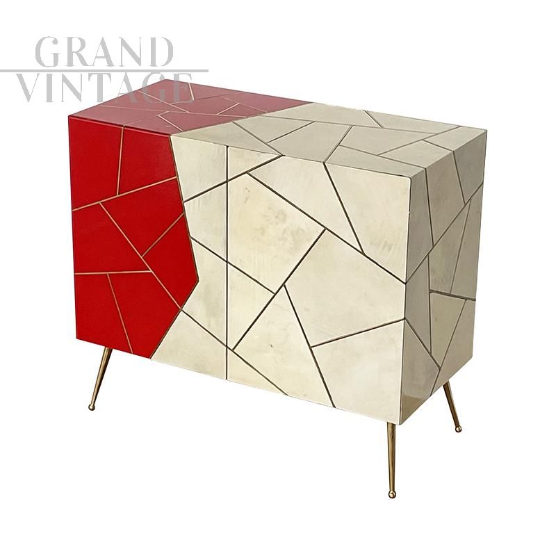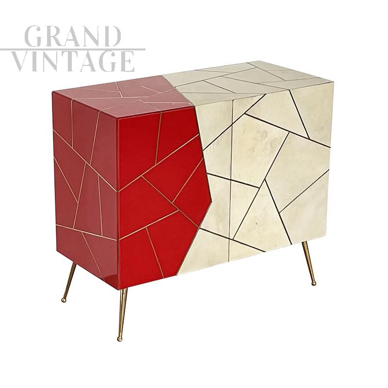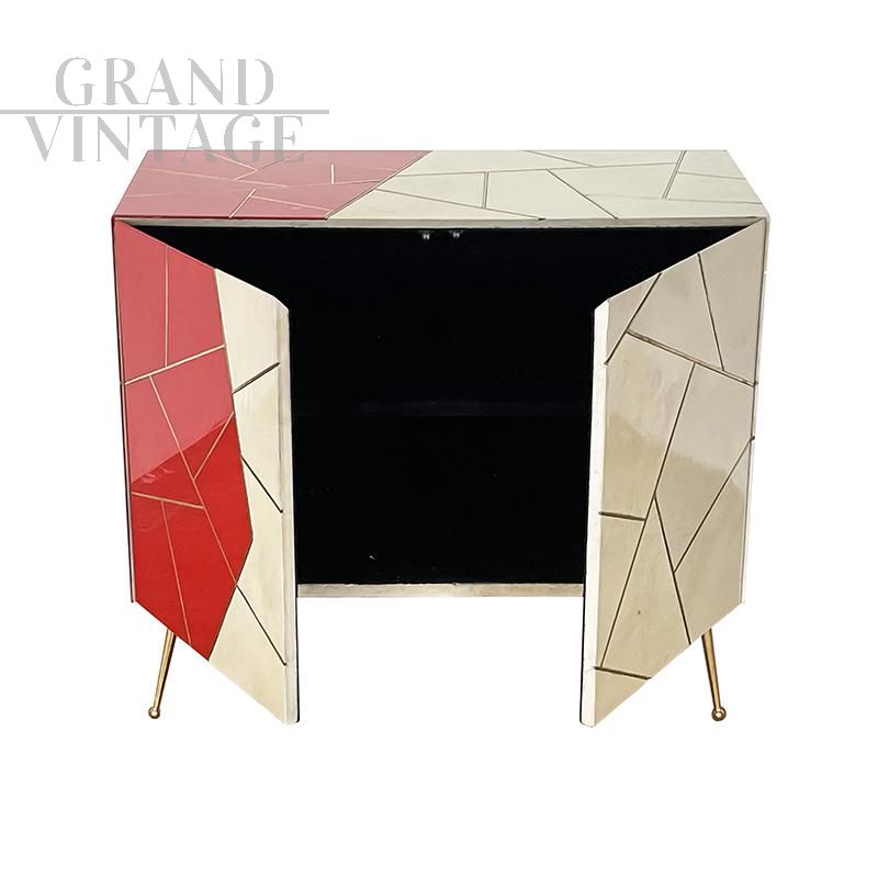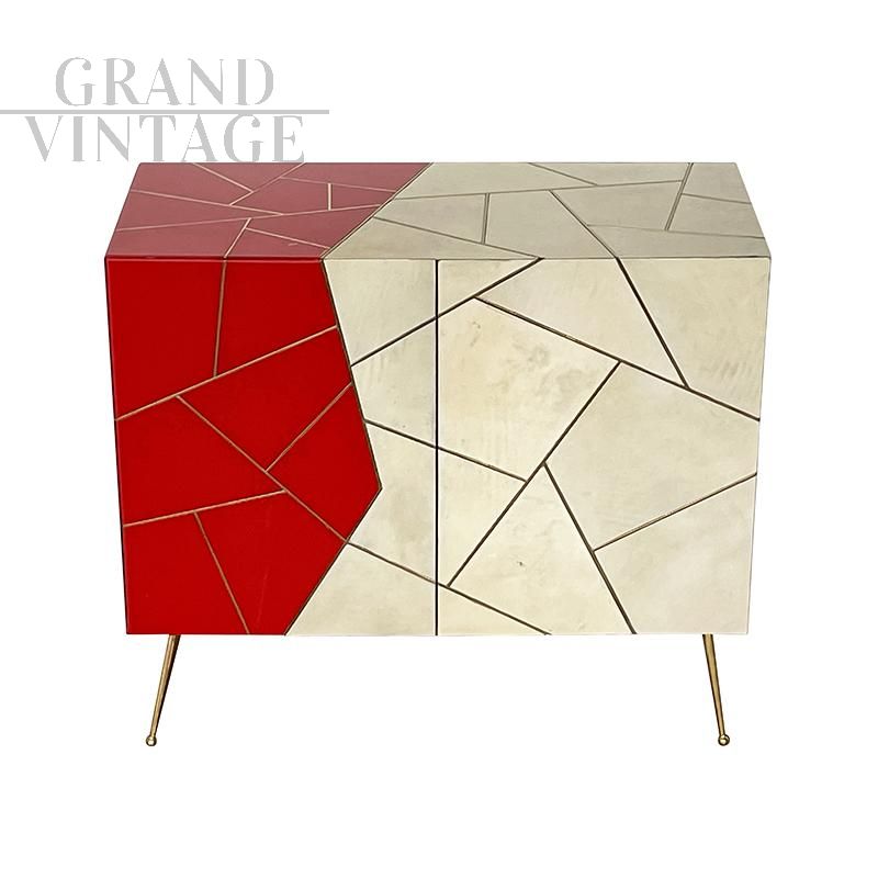 Credenza design in legno rivestita in vetro color pergamena naturale e rosso, caratterizzata da due ante con apertura push pull con ripiano interno, profili e piedi in ottone.