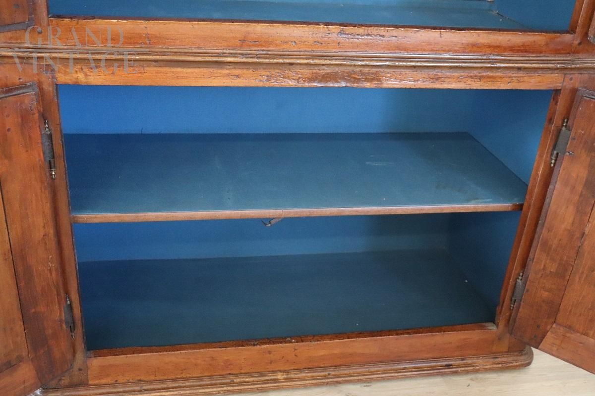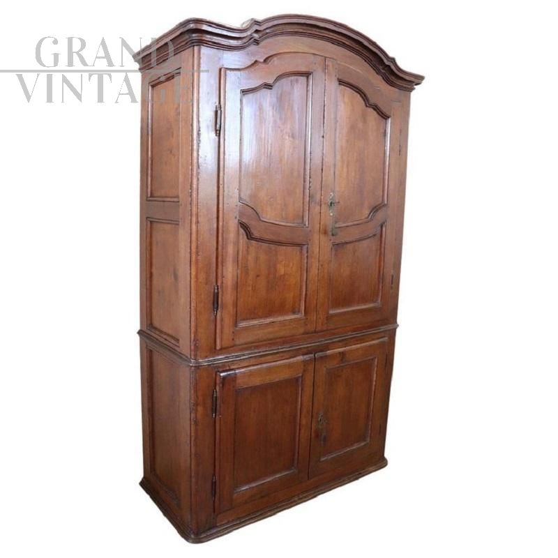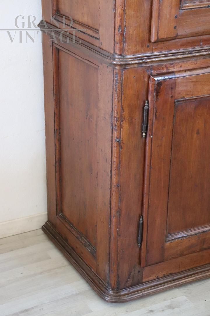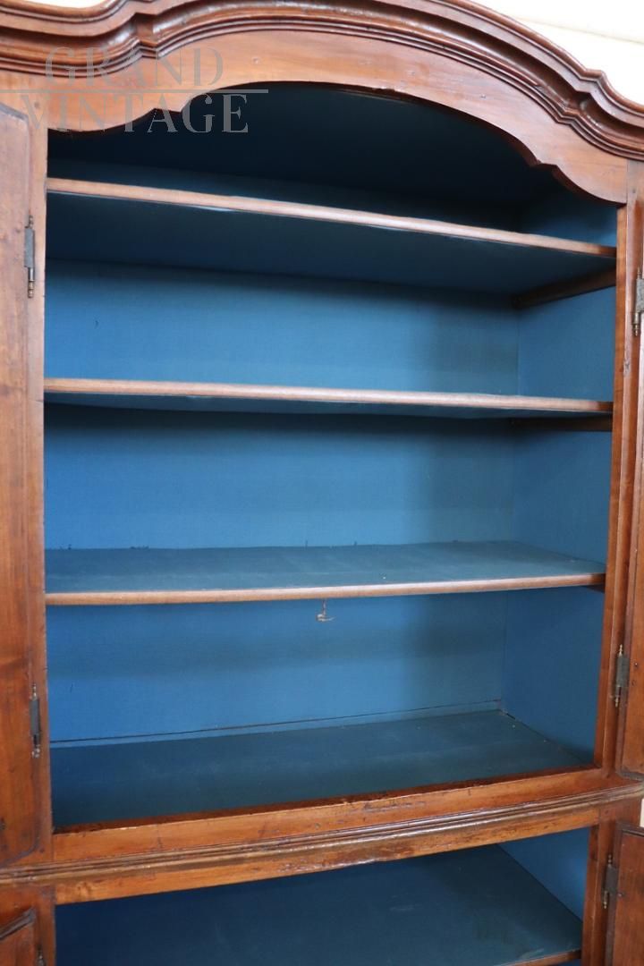 Vi presentiamo questo fantastico armadio o credenza antica italiana della metà del XVIII secolo. Un armadio maestoso dal fascino antico e senza tempo! Realizzata in pioppo massello, le sue caratteristiche stilistiche fanno pensare che sia stata realizzata da laboratori di ebanisteria della regione Piemonte, nell'Italia settentrionale durante l'epoca Luigi XV. Le sue linee semplici sono caratterizzate da alcune curve mosse nella cornice e nelle decorazioni delle ante. La sua struttura è divisa in due parti che possono essere separate, per facilitare gli spostamenti. Dal punto di vista funzionale, il mobile dispone di un ampio spazio di archiviazione, grazie a tre ripiani interni nella parte superiore e uno in quella inferiore. L'interno è rivestito in elegante tessuto blu. Prezzo trattabile