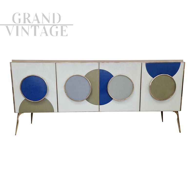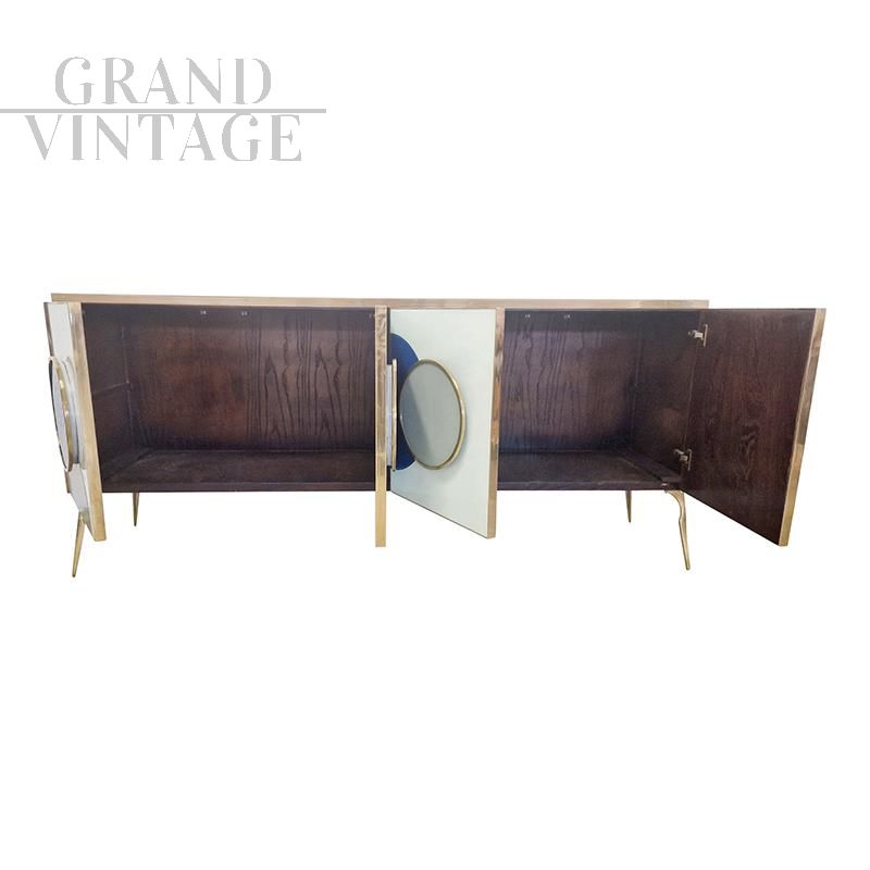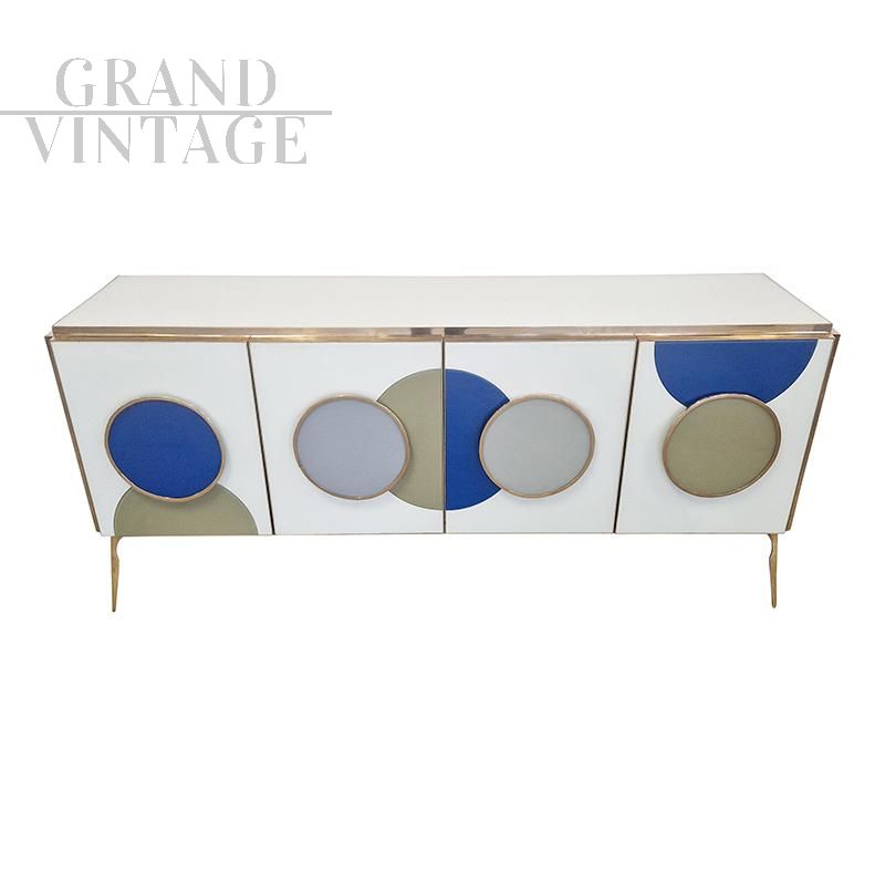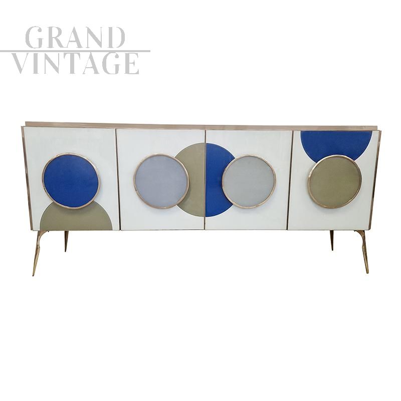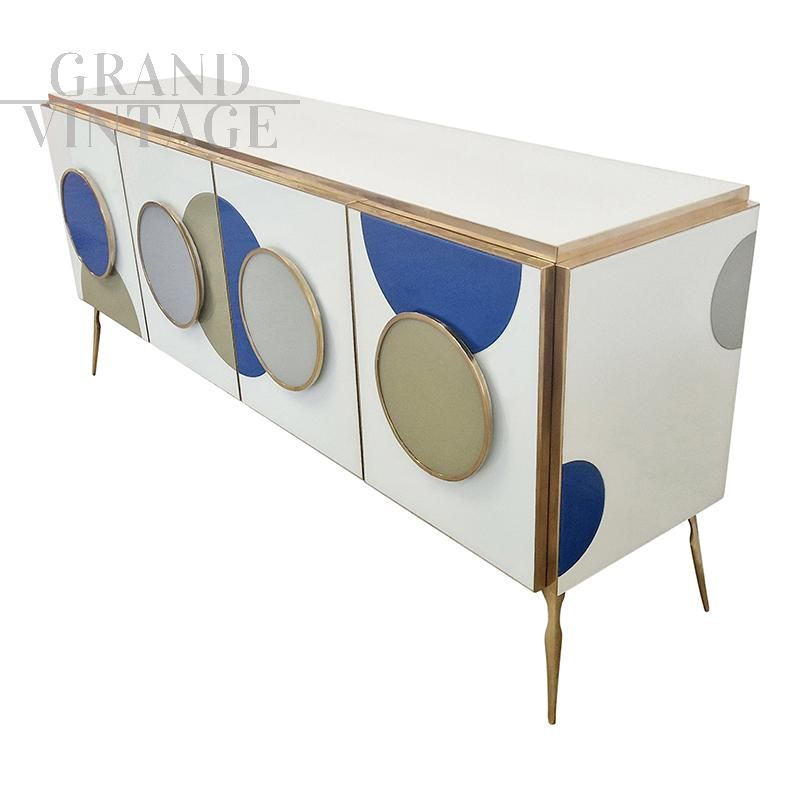 Credenza design a quattro ante con ripiano interno, interamente realizzata a mano, con struttura in legno rivestita in vetro bianco. Profili e piedi in ottone dorato. Maniglie tonde colorate retroilluminate a led.