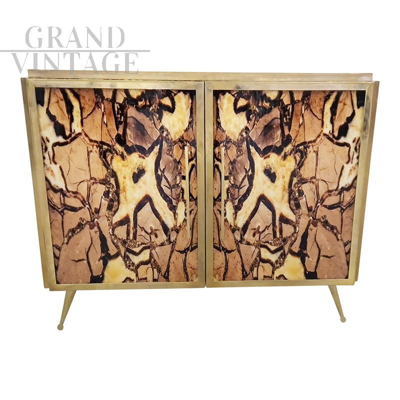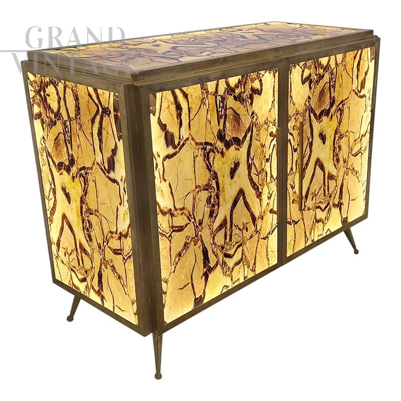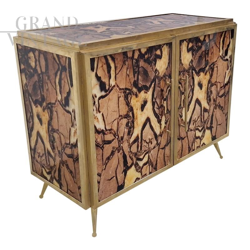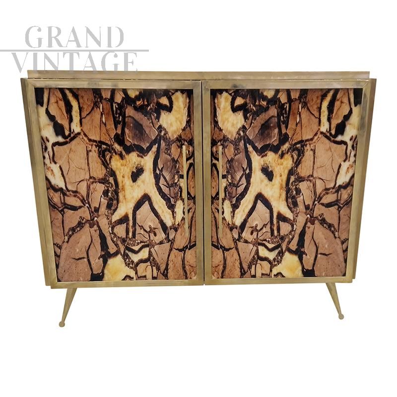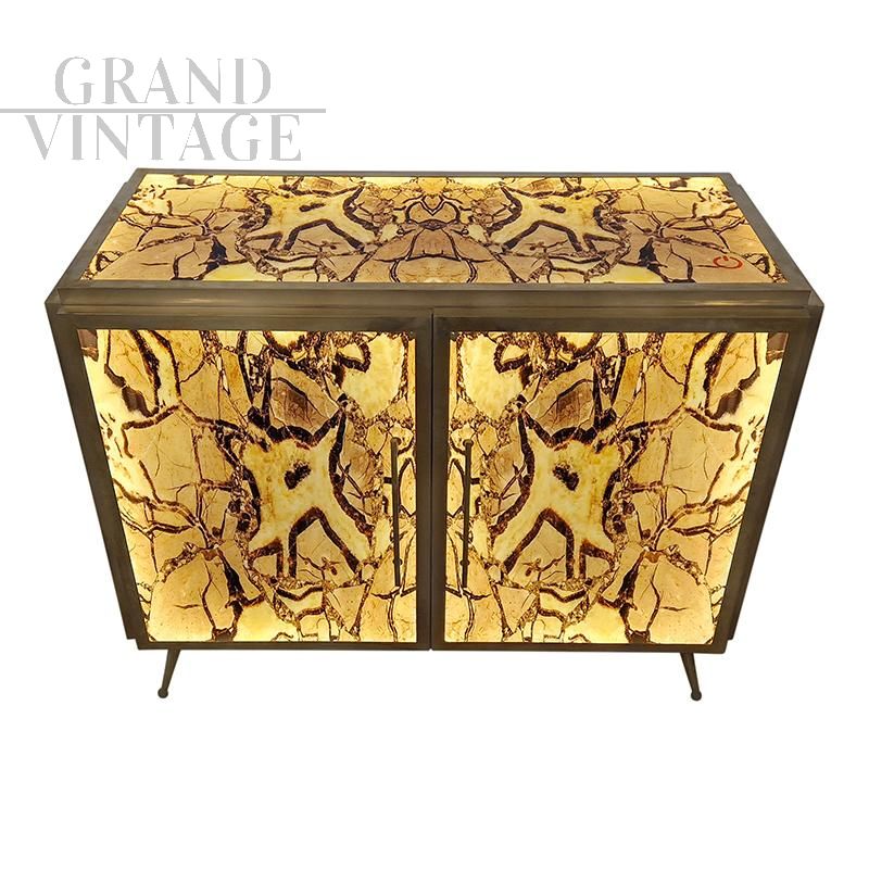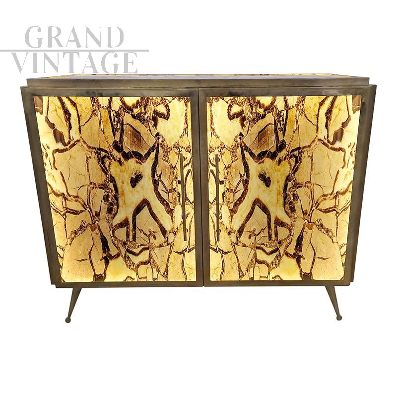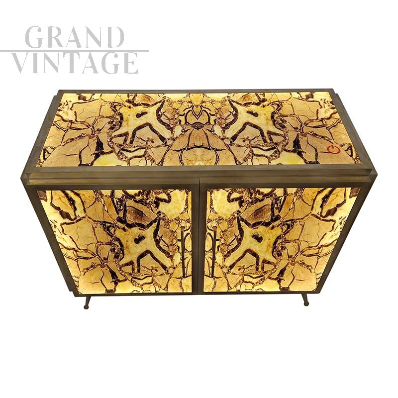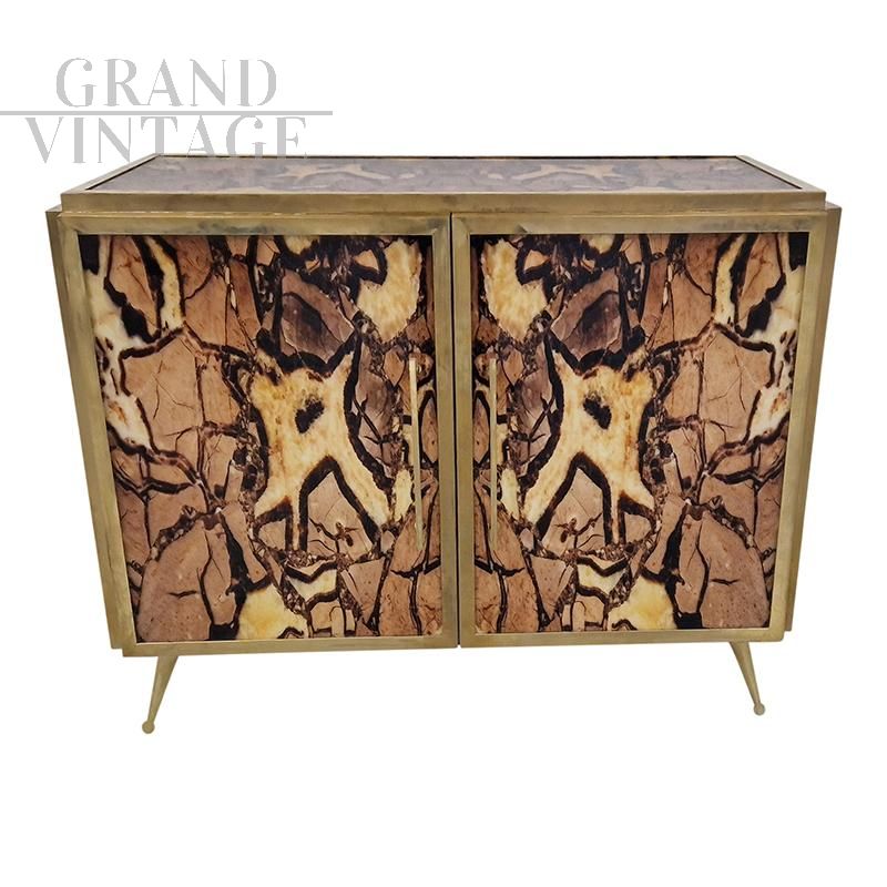 Credenza due ante interamente realizzata a mano, struttura in legno rivestita vetro stampato nelle tonalità del marrone, maniglie, profili e piedi in ottone dorato, ripiano interno in vetro. L'interno è rivestito a specchio e illuminato. La struttura si illumina con luce a gradazione con apposito telecomando.