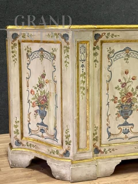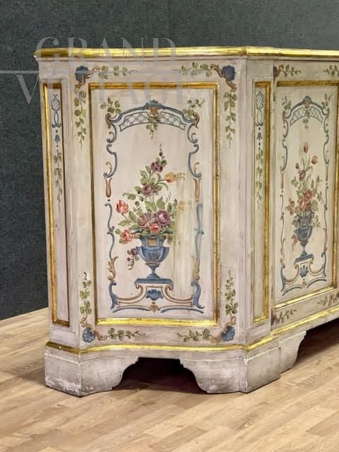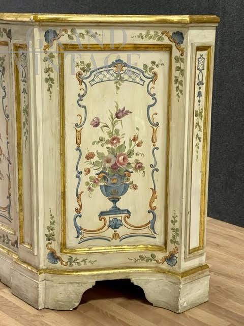 Credenza scantonata di stile Barocco elegantemente laccata con decori floreali di gusto Luigi XVI, realizzata nella prima metà del '900. La credenza presenta un fronte mosso con due ante centrali, piano superiore decorato con la tecnica del finto marmo, piedi a mensola. Gli interni sono laccati e serviti da un ripiano centrale. La credenza risulta di buona fattura e di ottime proporzioni, strutturalmente sana e nel complesso in buono stato di conservazione.