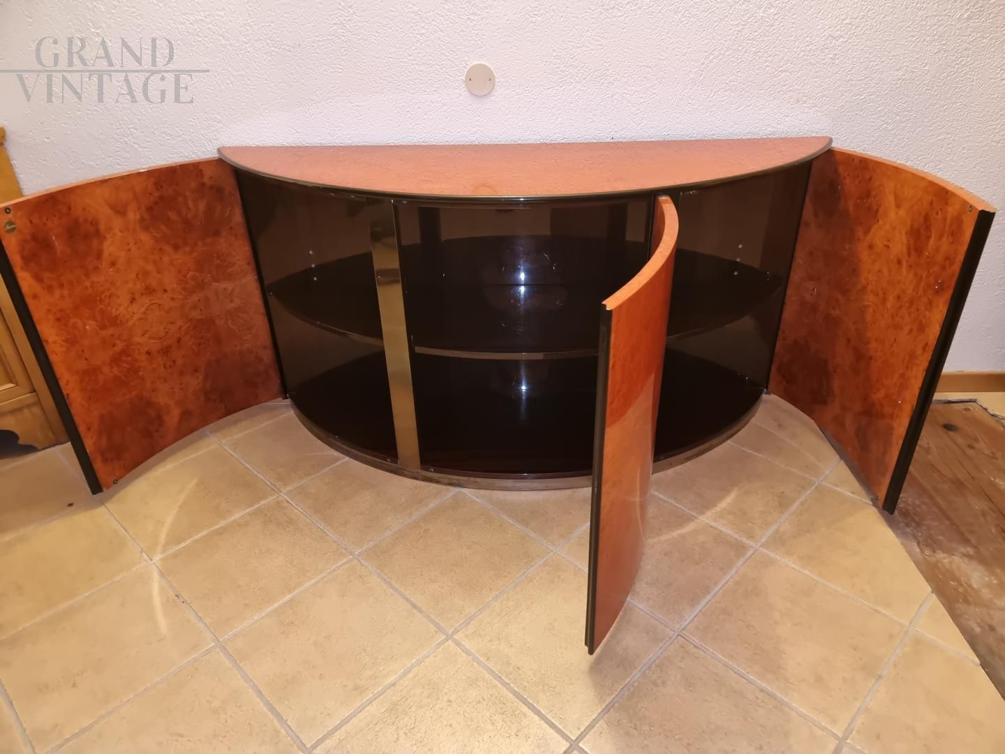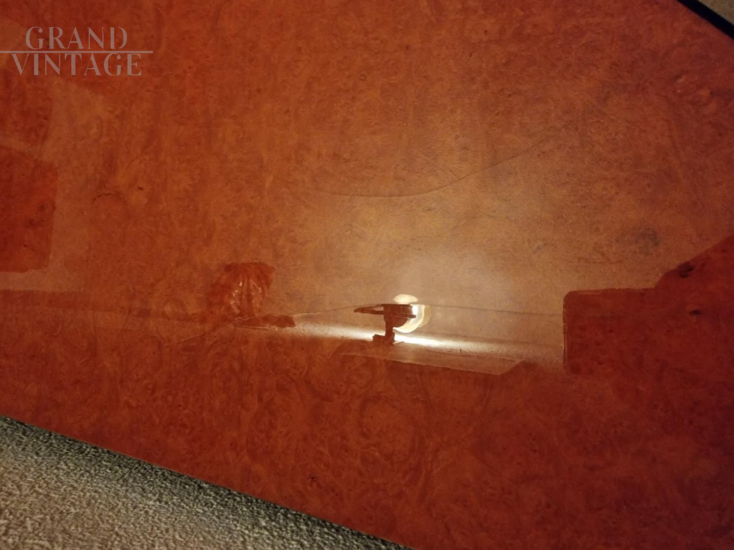 Magnifica e rara credenza modello MB7 Curvo di Luigi Caccia Dominioni per Azucena in radica d'acero, anni '70. Presenti 2 segni in rilievo nella parte superiore come da foto.