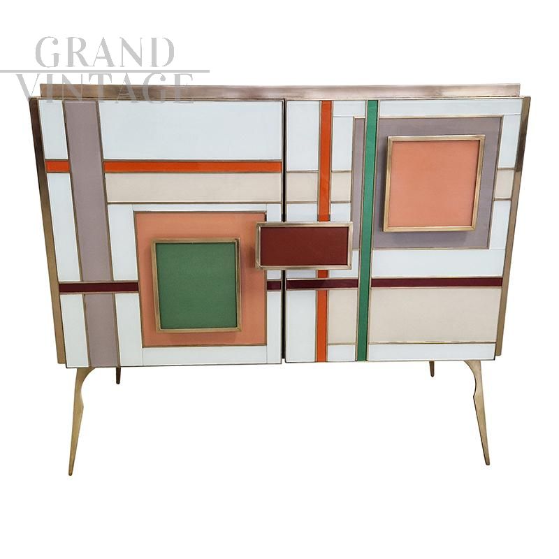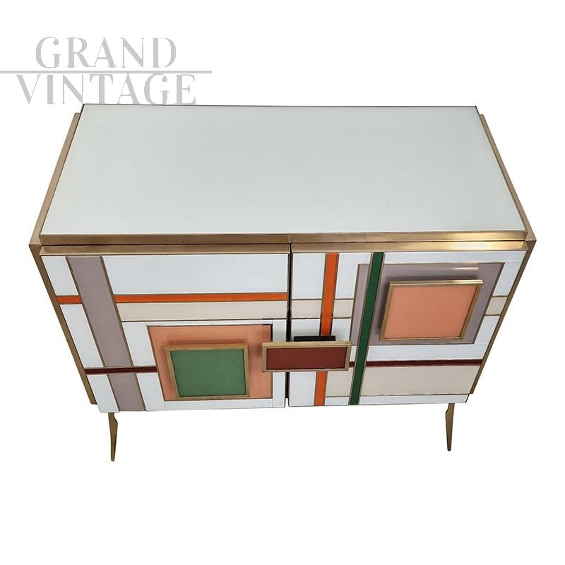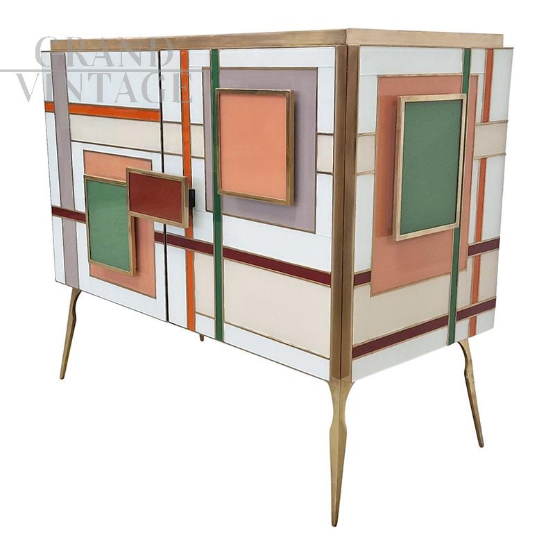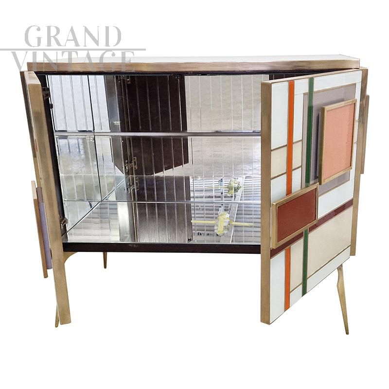 Piccola credenza o mobile bar design interamente realizzata a mano, con due ante e un vano interno rivestito a specchio e dotato di un ripiano interno in vetro trasparente, struttura in legno rivestita con inserti di vetro multicolore, strip led per illuminazione a perimetro degli elementi sporgenti e delle maniglie; profili e piedi in ottone.