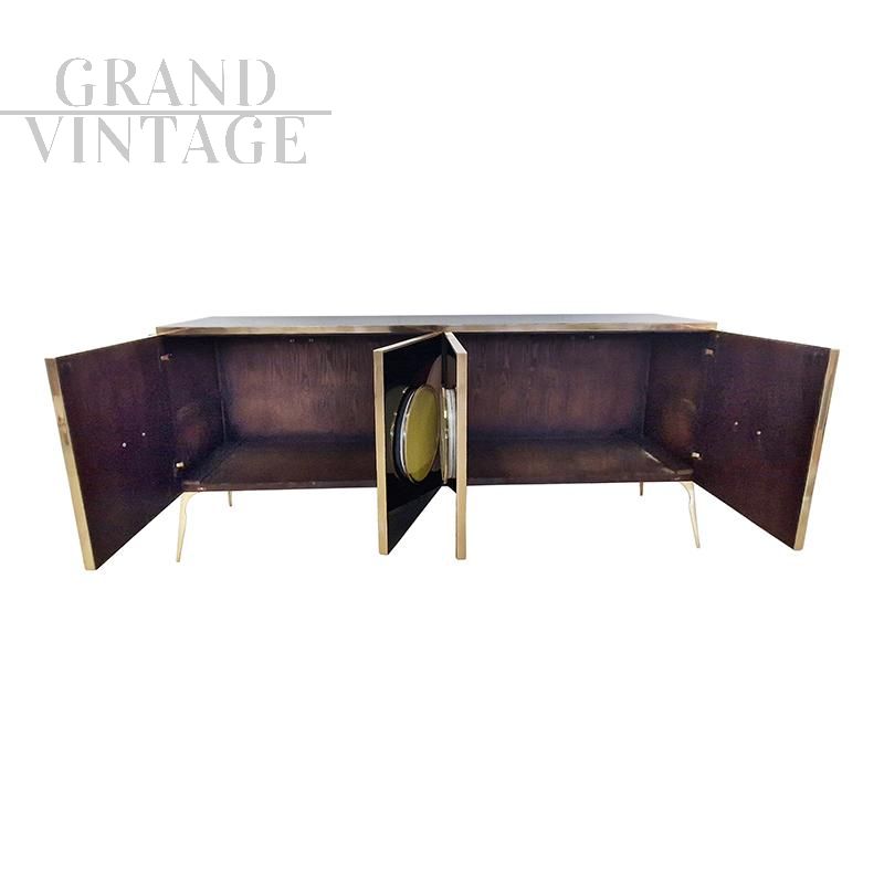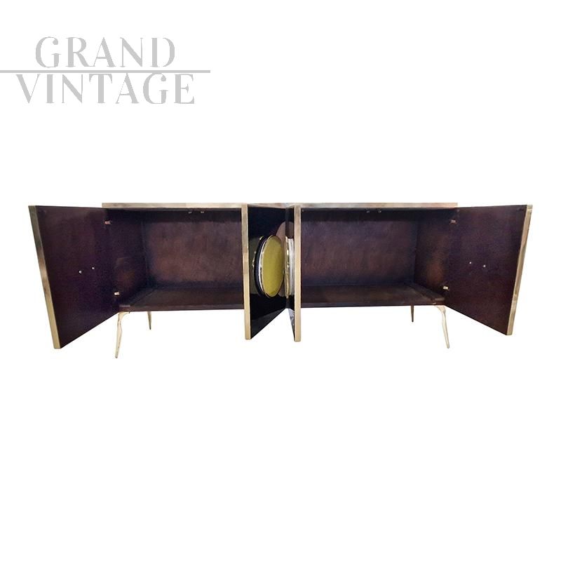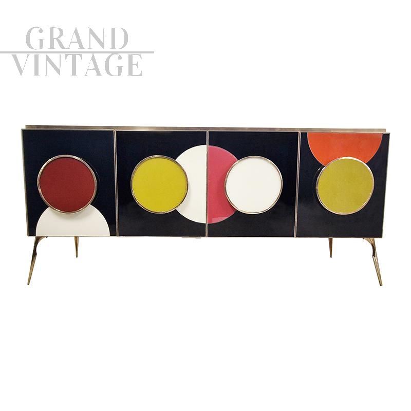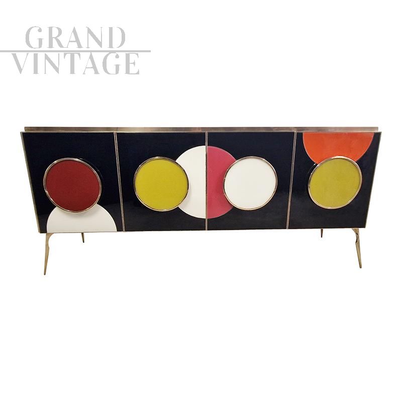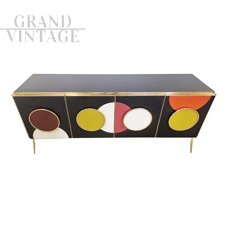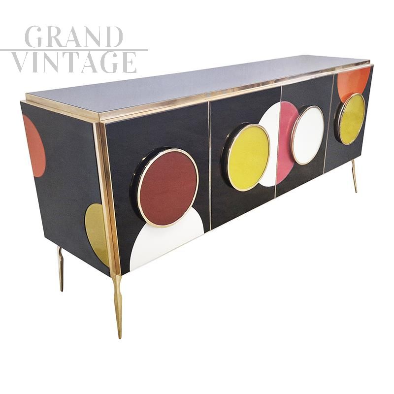 Credenza design a quattro ante con ripiano interno, interamente realizzata a mano, con struttura in legno rivestita in vetro nero. Profili e piedi in ottone dorato. Maniglie tonde colorate retroilluminate a led.