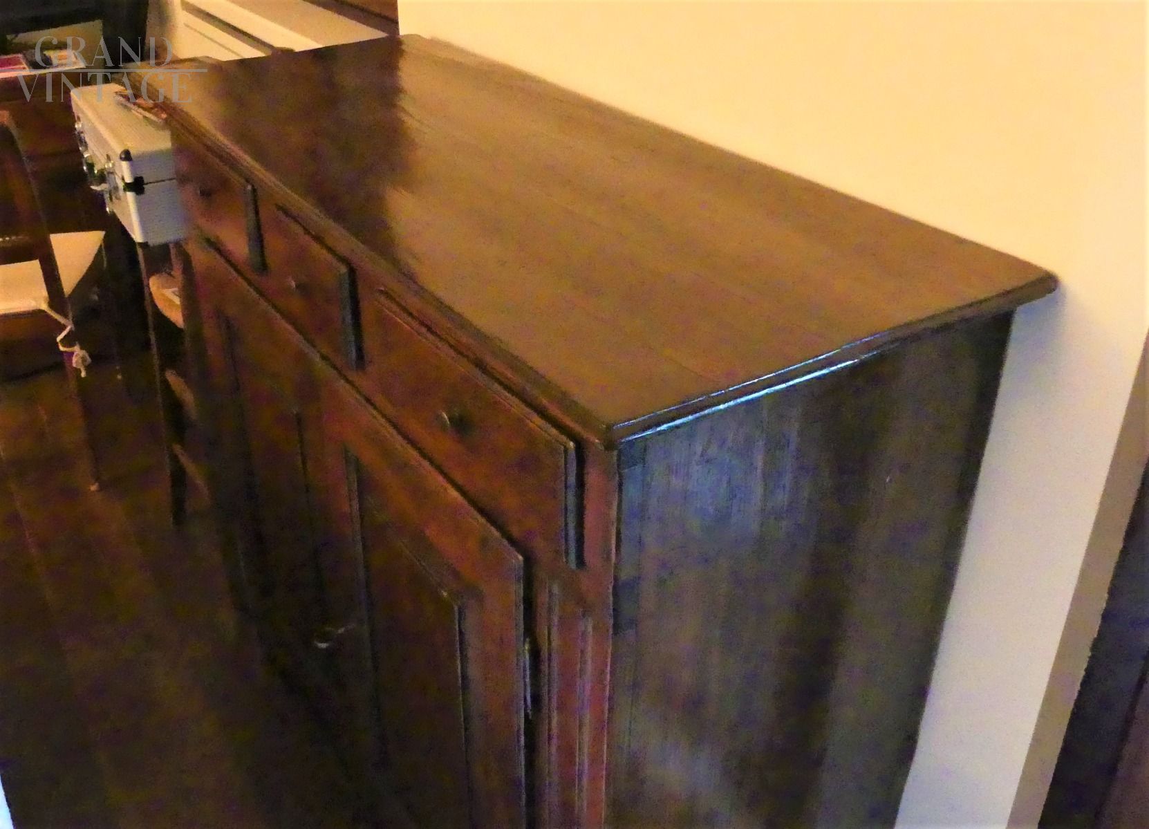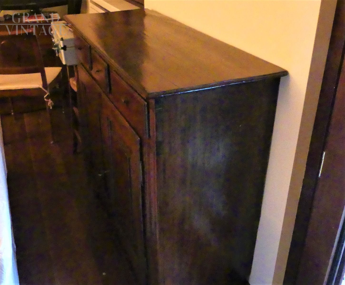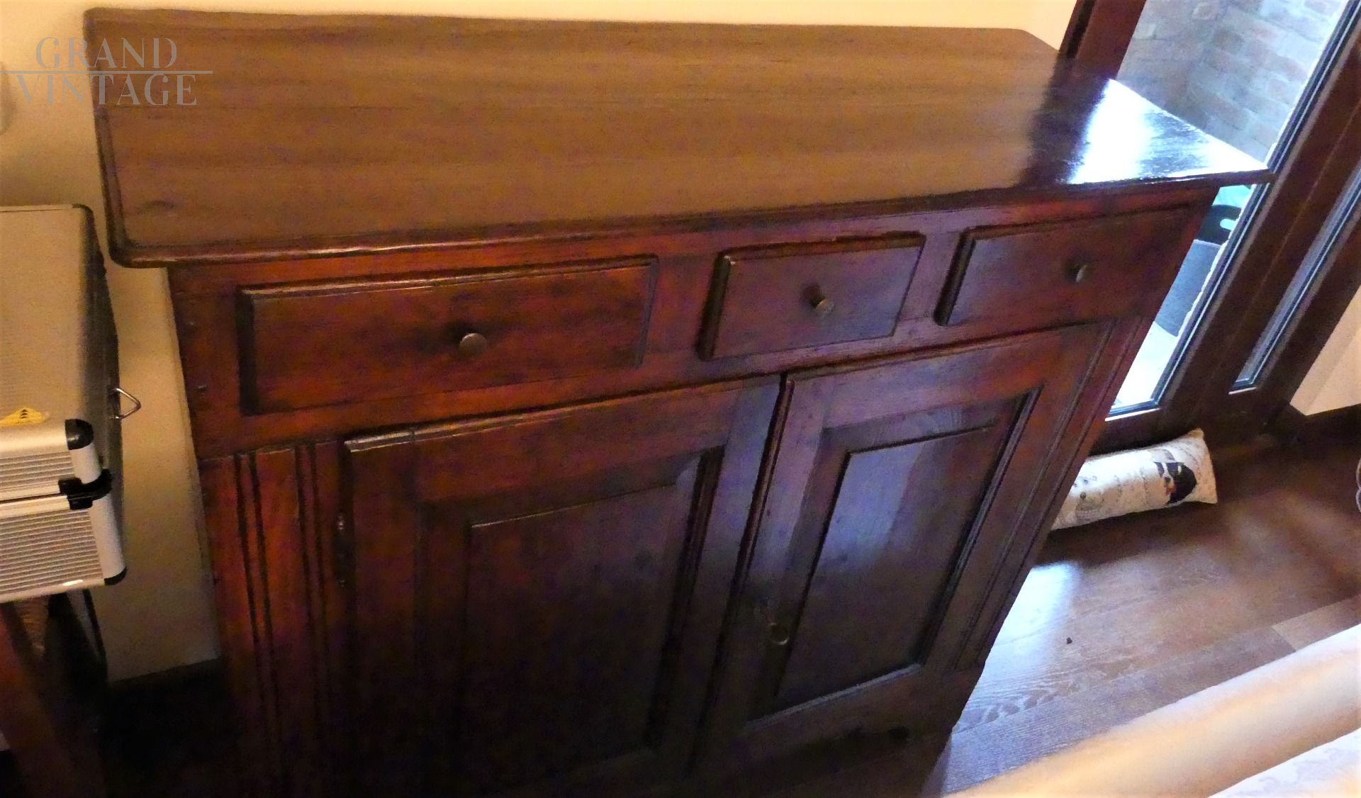Credenza antica rustica dell'800 di provenienza Lombarda, con due ante nella parte inferiore e tre cassetti nella parte superiore, in legno scuro, in buono stato originale.