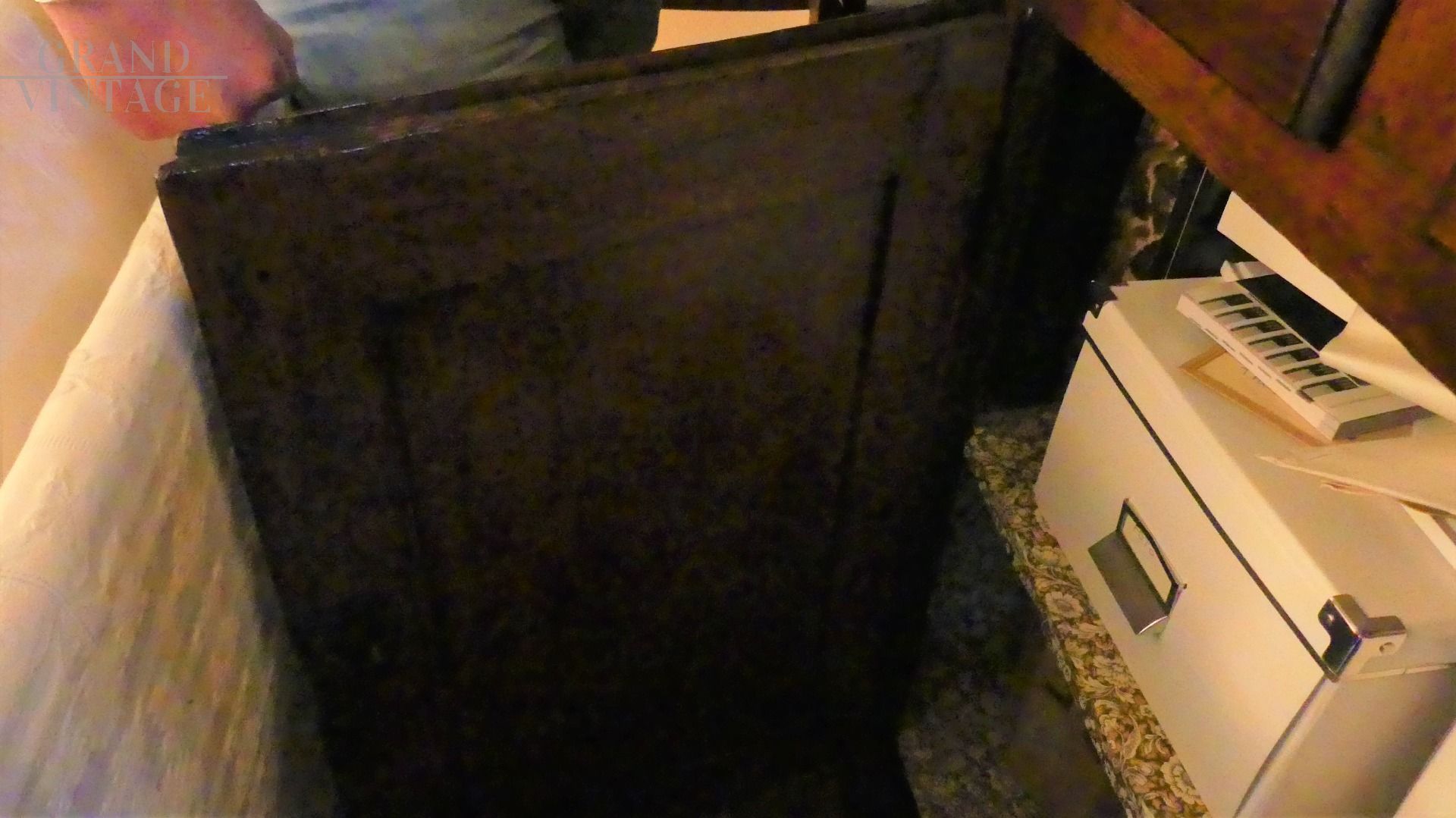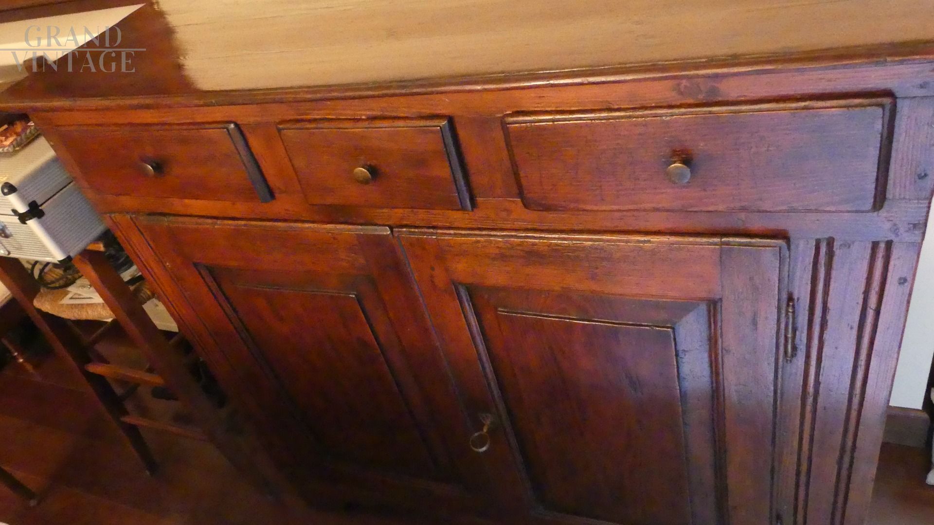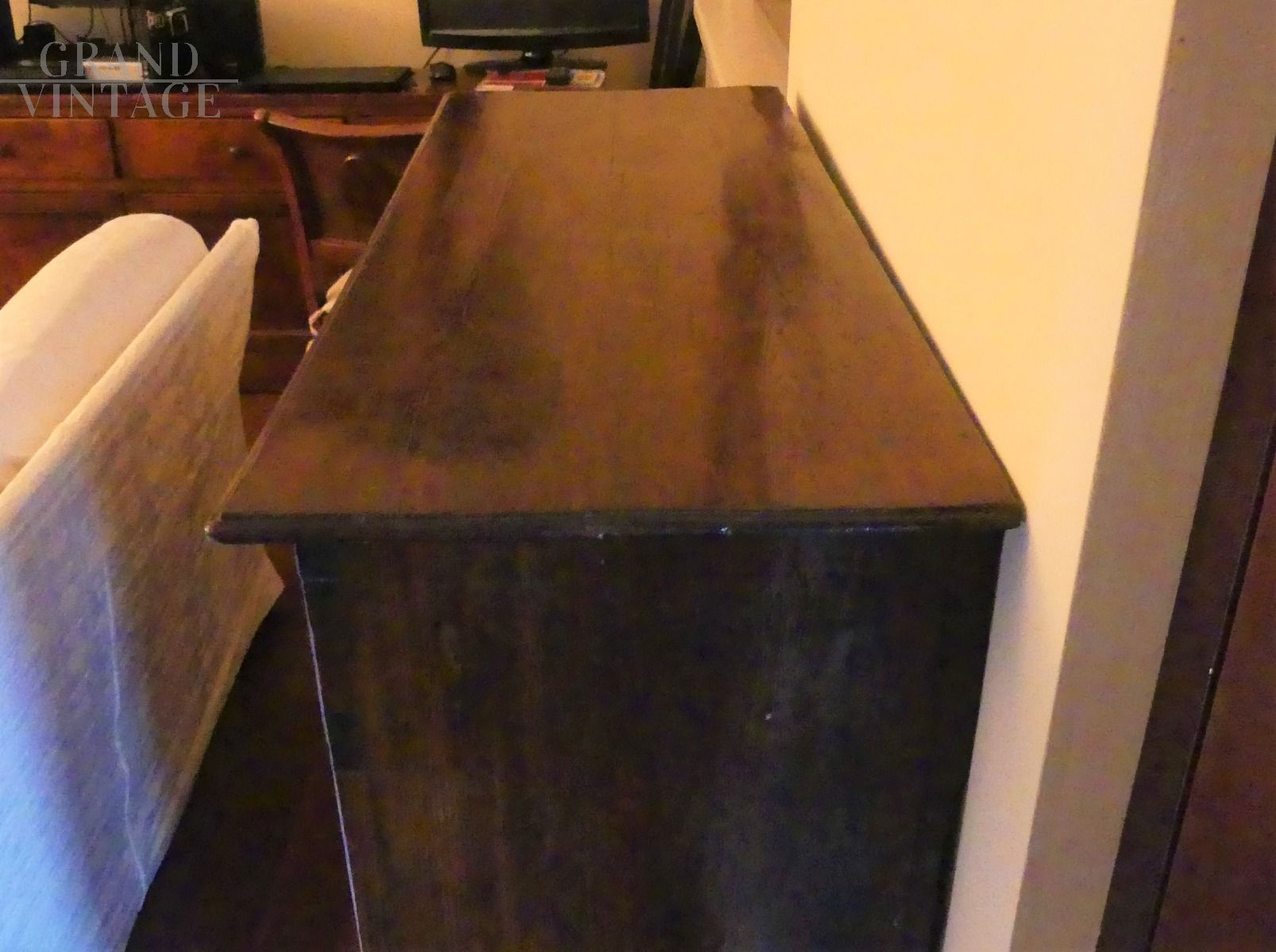 Credenza antica rustica dell'800 di provenienza Lombarda, con due ante nella parte inferiore e tre cassetti nella parte superiore, in legno scuro, in buono stato originale.
