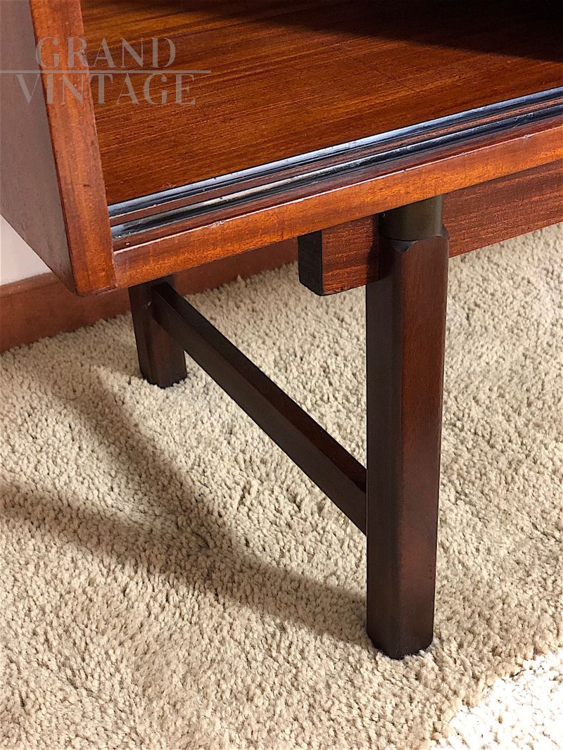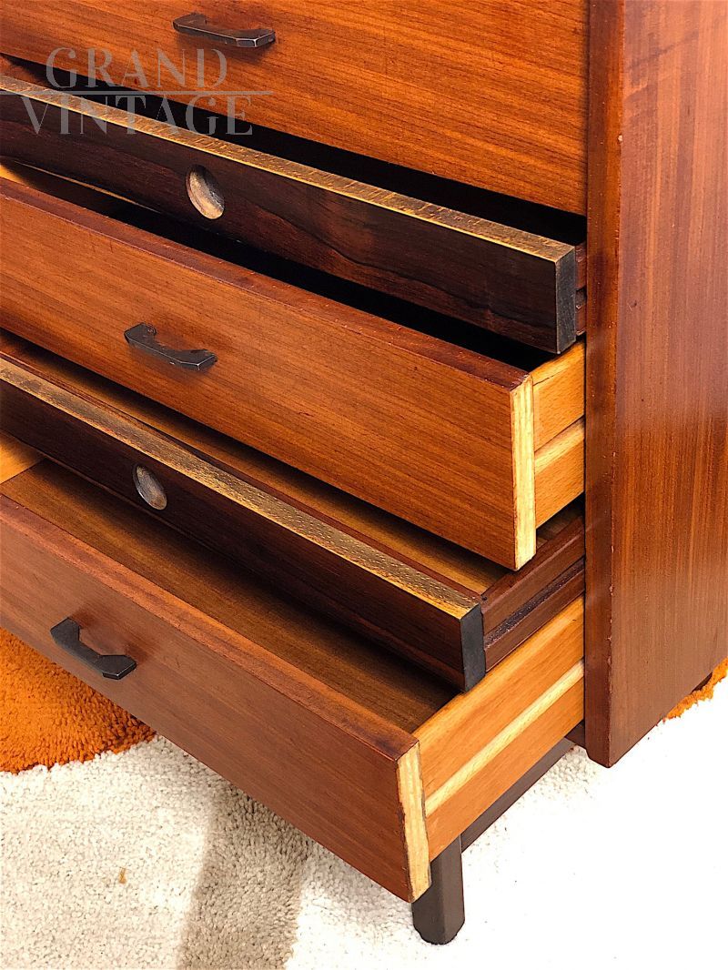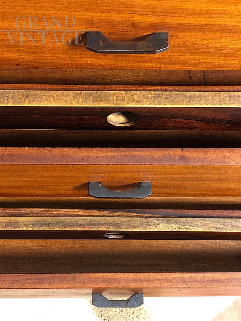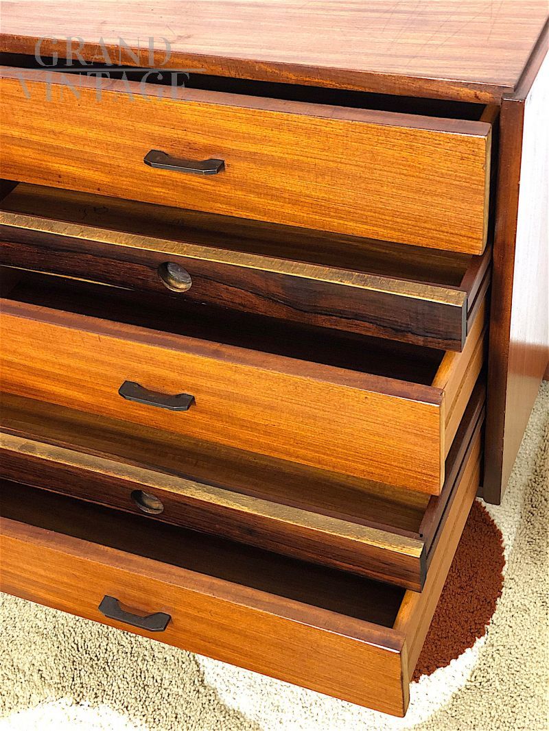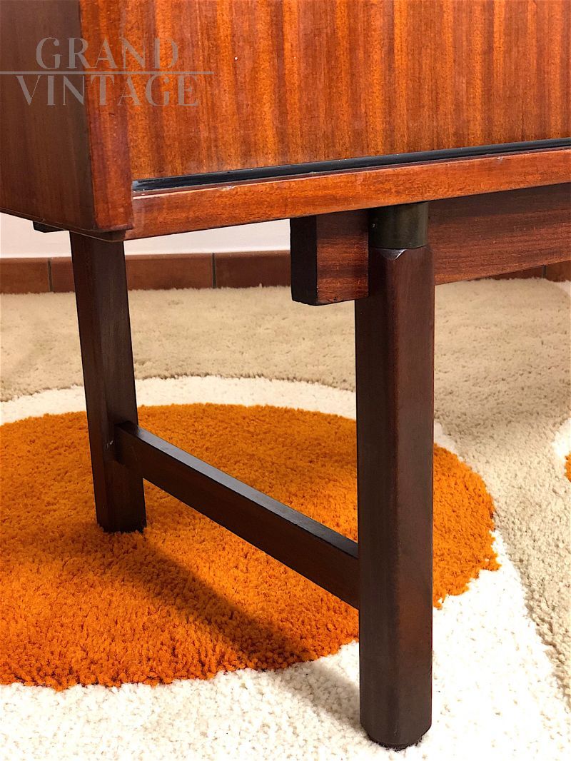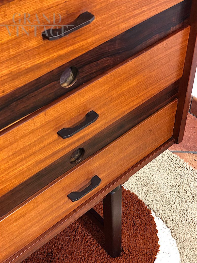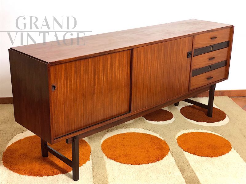 Mobile Credenza Sideboard Barovero by Selex, Italia anni '60. Il design Minimale ed elegante per questo Sideboard realizzato dall'azienda BAROVERO di Torino per la linea Selex. Il mobile è realizzato con un altissima qualità e ricca di dettagli:bordi asimmetrici, maniglie e accessori in ottone bronzato, parti in legno laccato. Il mobile è composto da una coppia di ante laterali scorrevoli e ripiani interni, cinque cassetti:tre cassetti grandi con maniglie in metallo e due piccoli con scasso circolare,gambe in legno con dettali in metallo. Realizzato in legno con impiallacciatura in Teak. Il Sideboard è stato completamente restauratoed è in condizioni perfette.