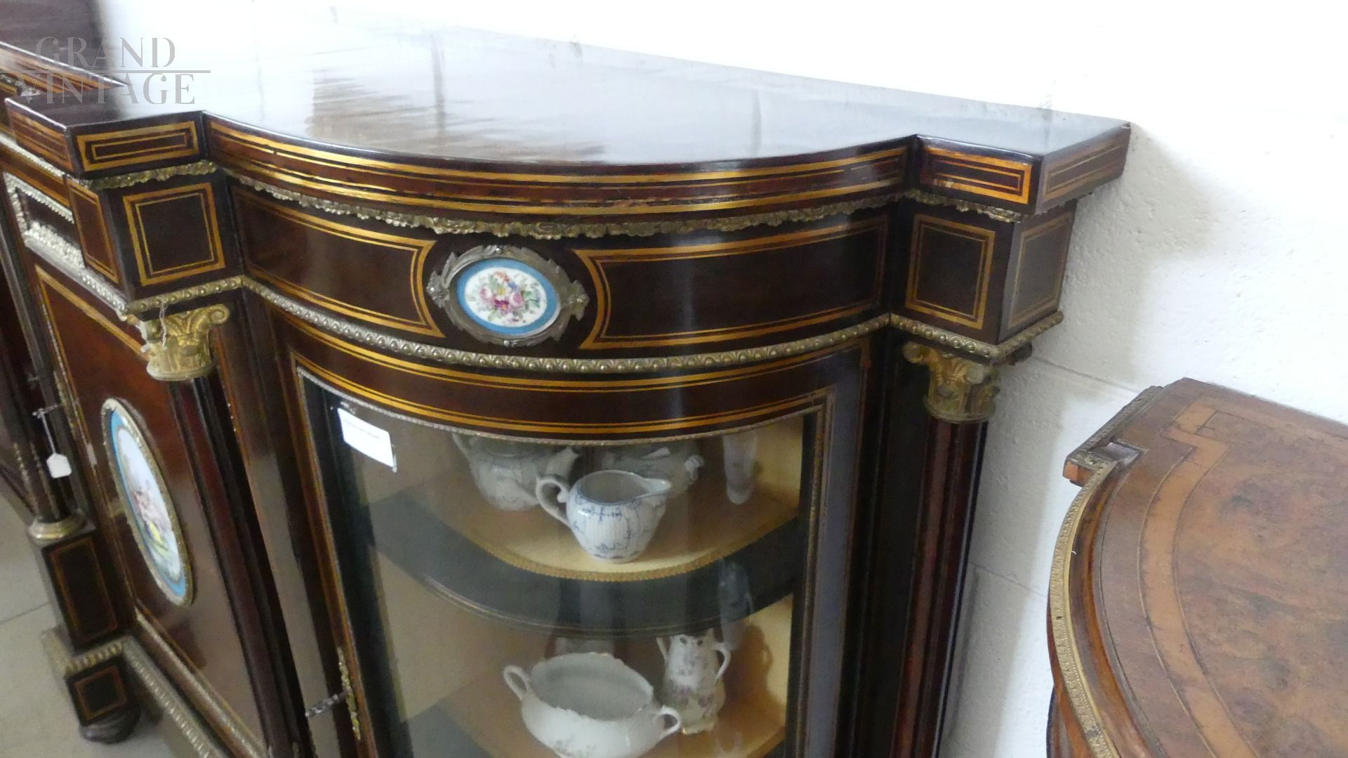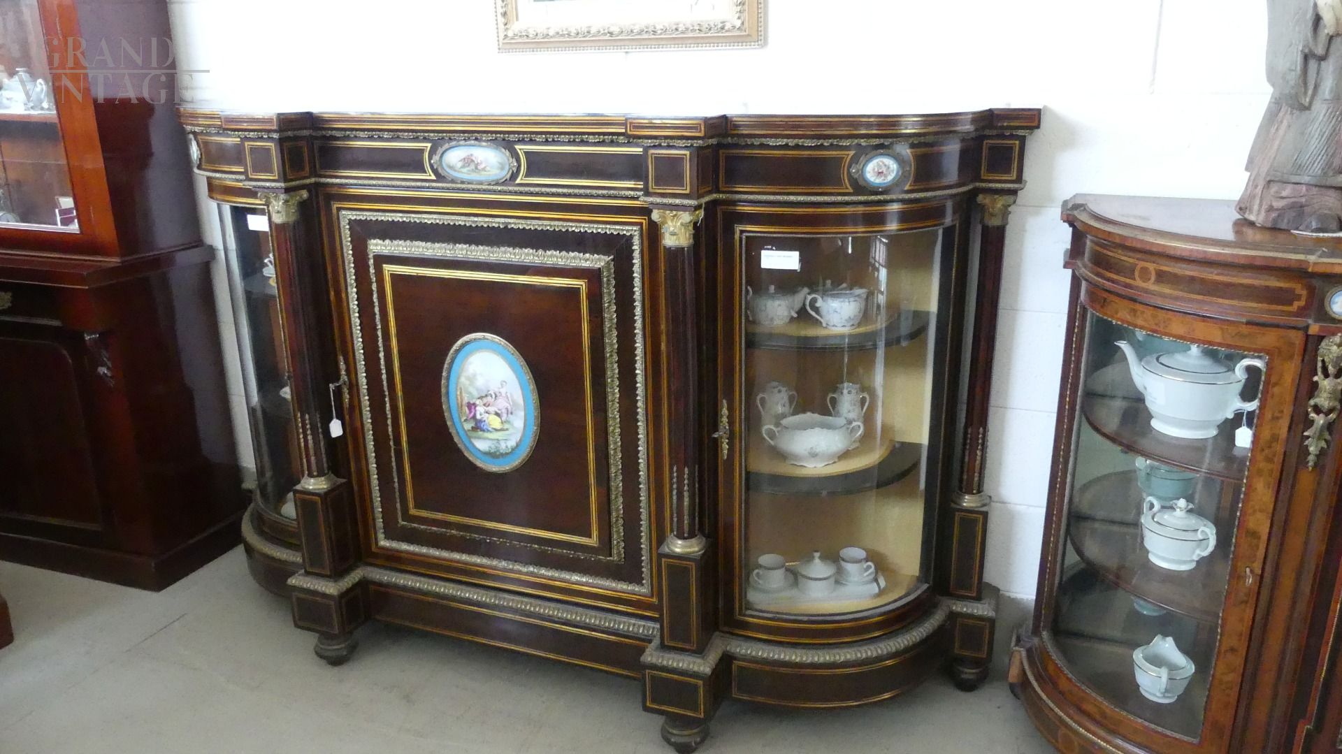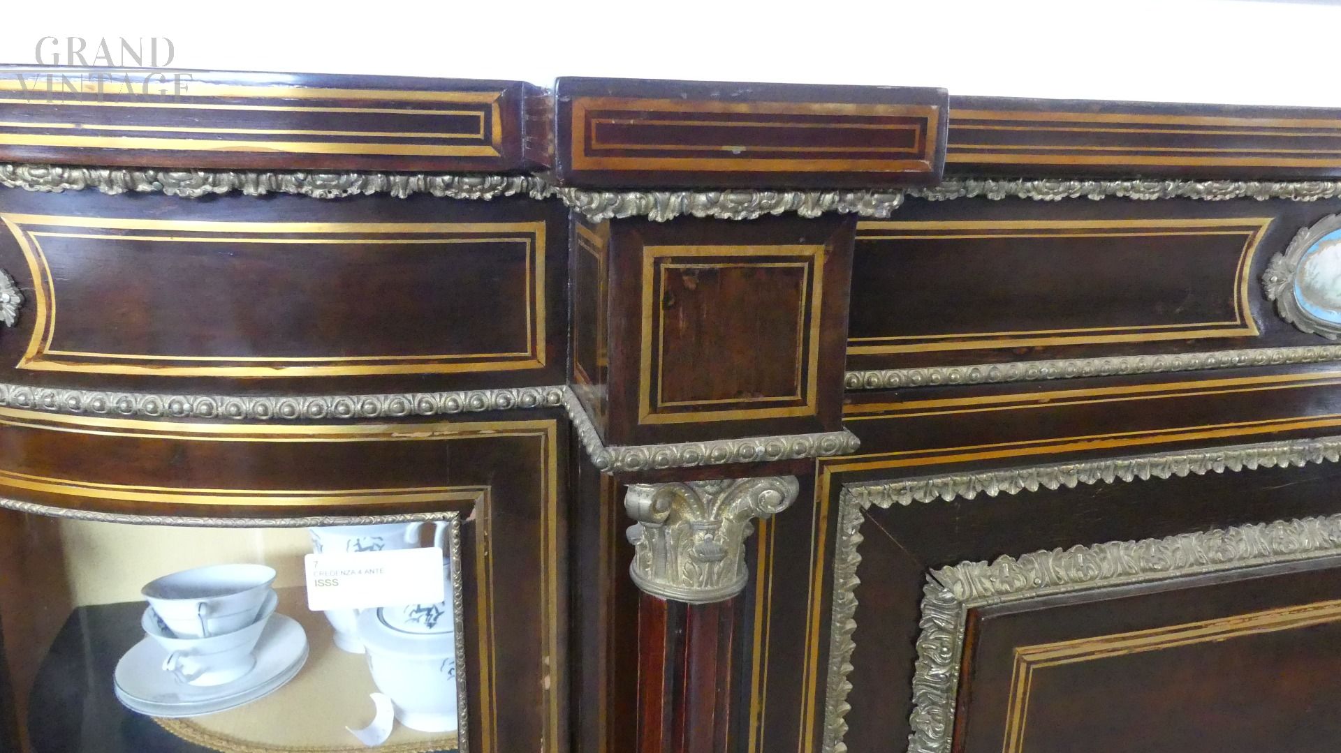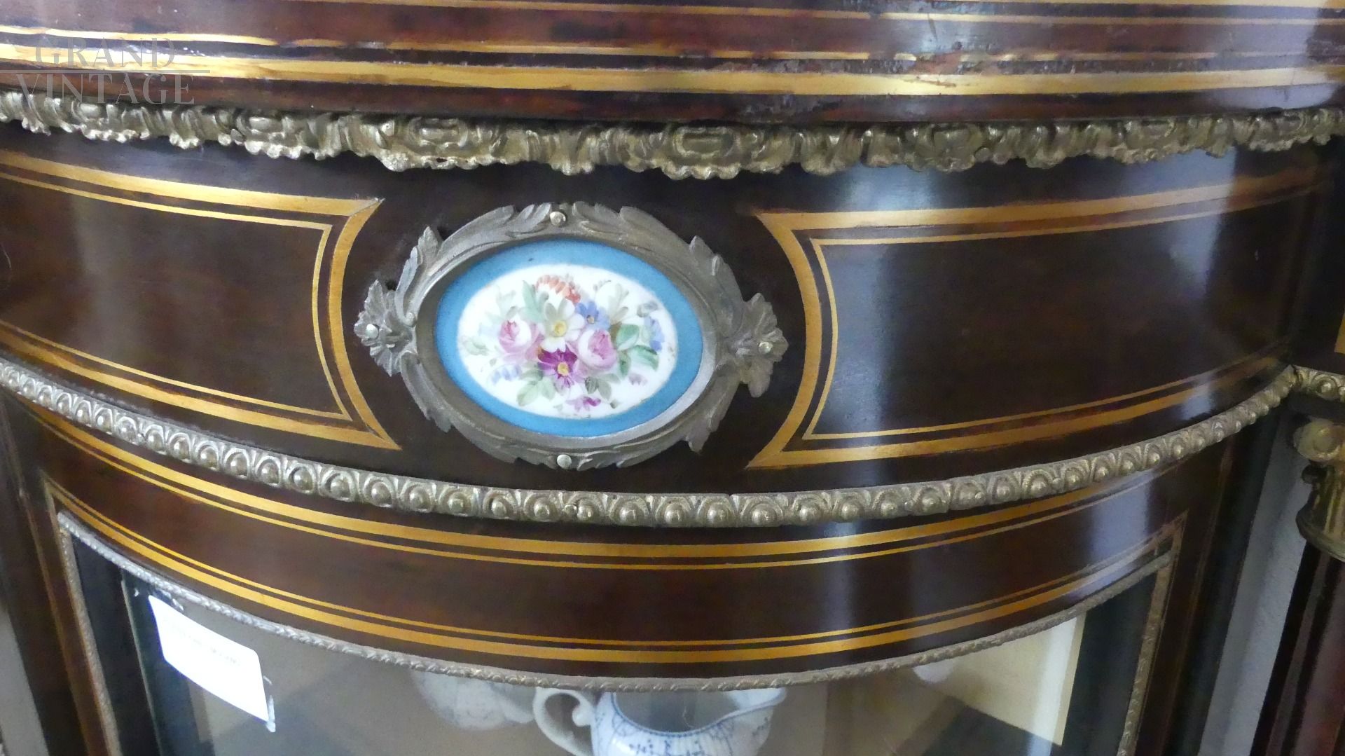 Bellissima e imponente credenza vetrina Boulle antica dell'inizio dell'800, in legno di mogano, intarsiata e filettata con legni vari, con fantastici ovali in ceramica Villeroy & Boch dipinti a mano e completa di cornici e fregi in ottone.