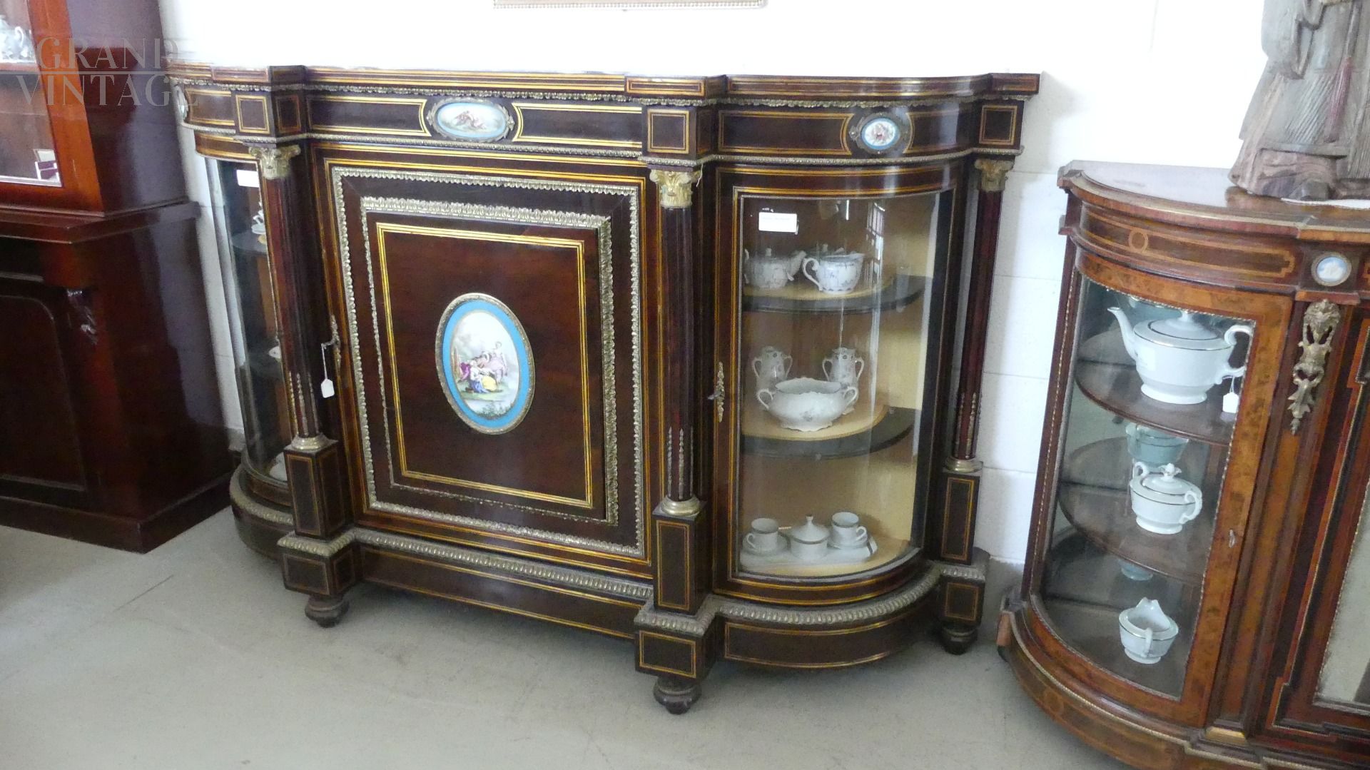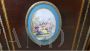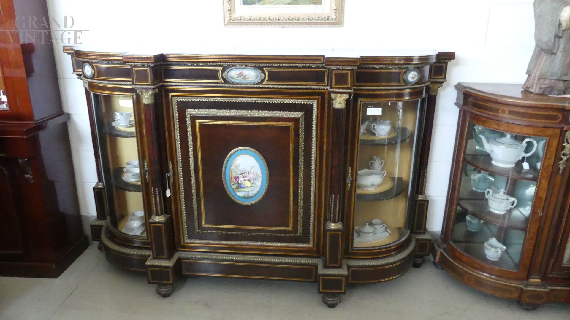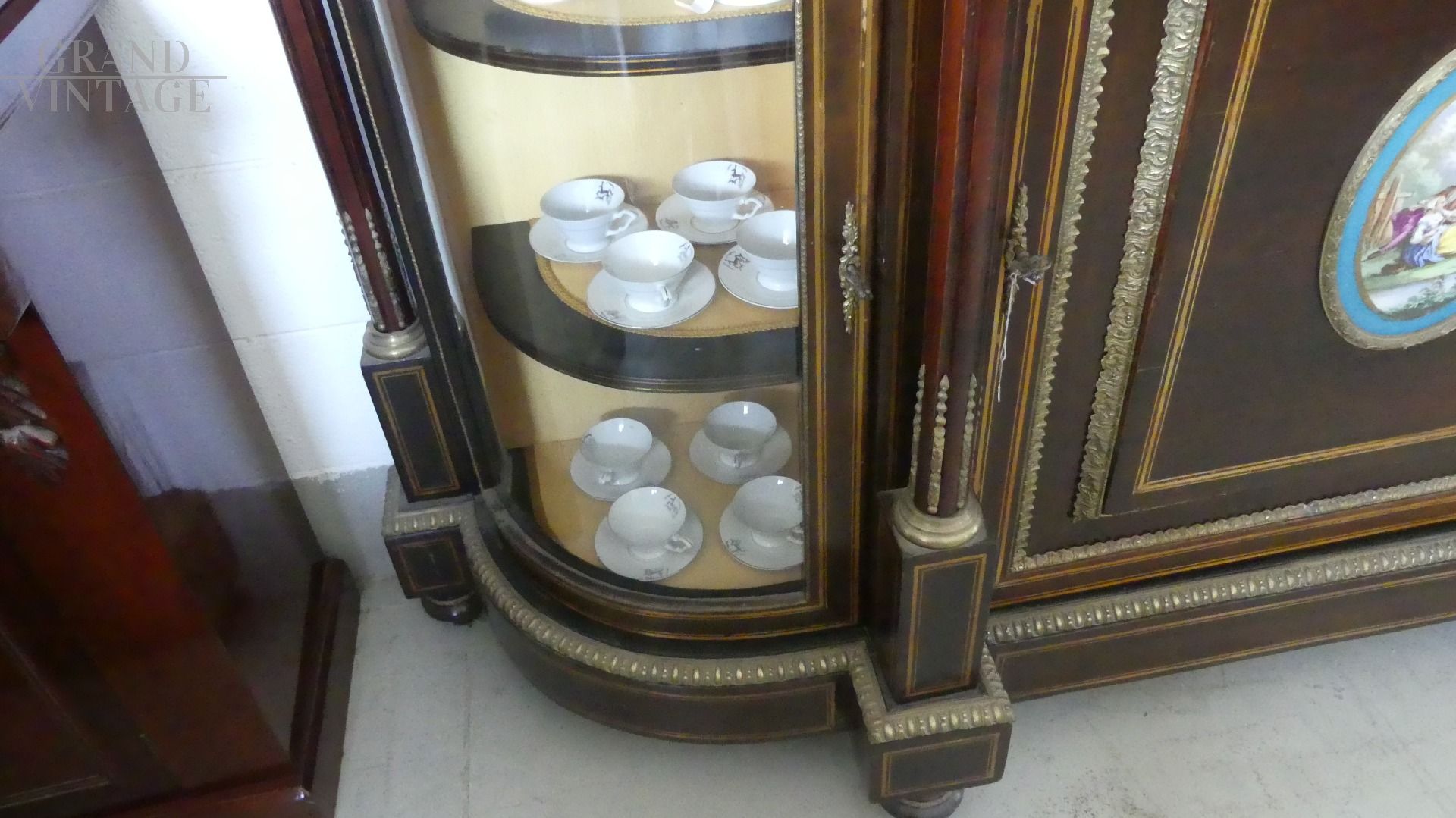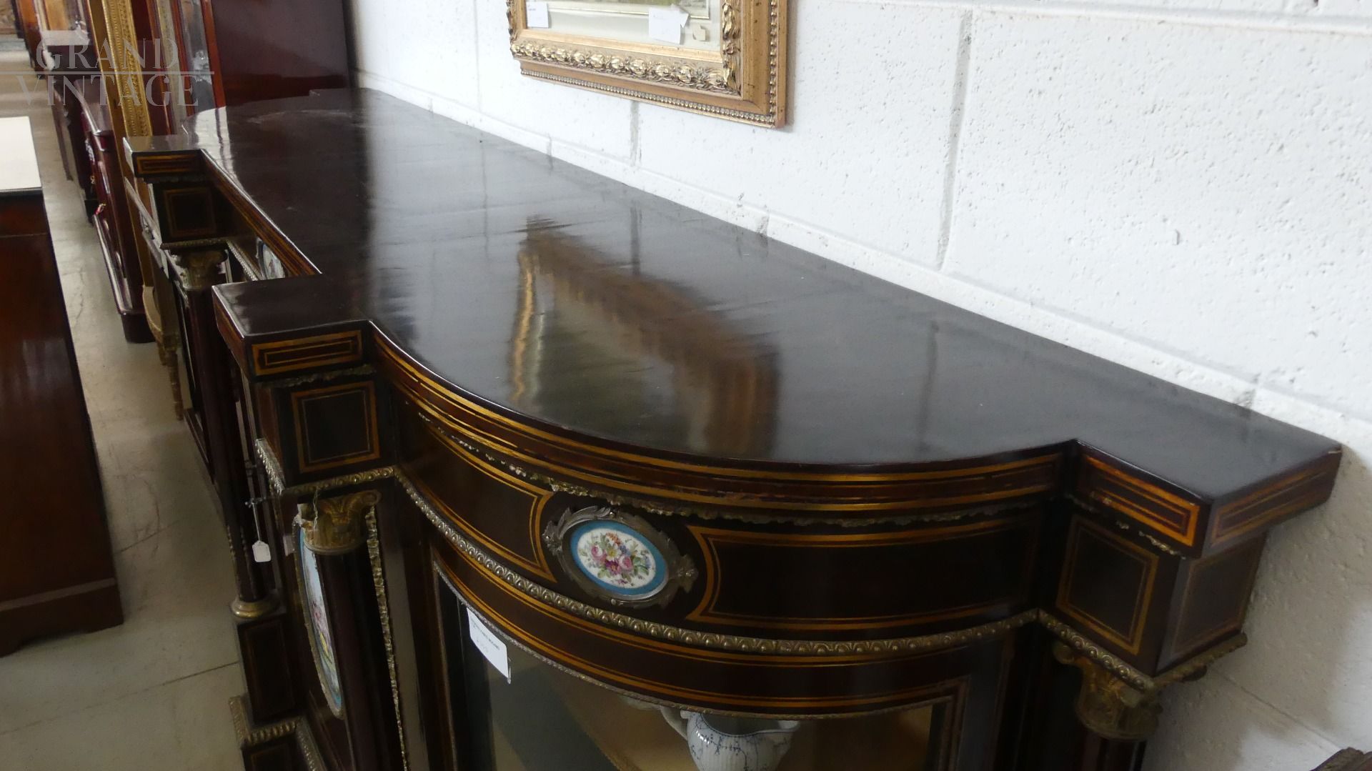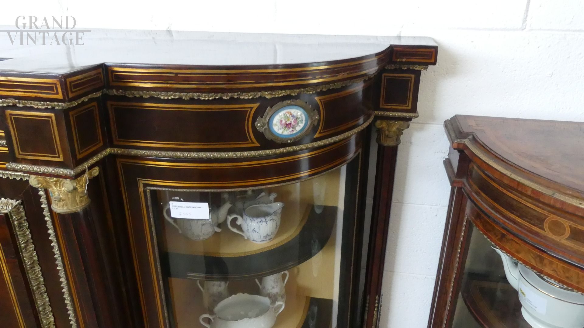 Bellissima e imponente credenza vetrina Boulle antica dell'inizio dell'800, in legno di mogano, intarsiata e filettata con legni vari, con fantastici ovali in ceramica Villeroy & Boch dipinti a mano e completa di cornici e fregi in ottone.
