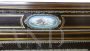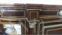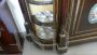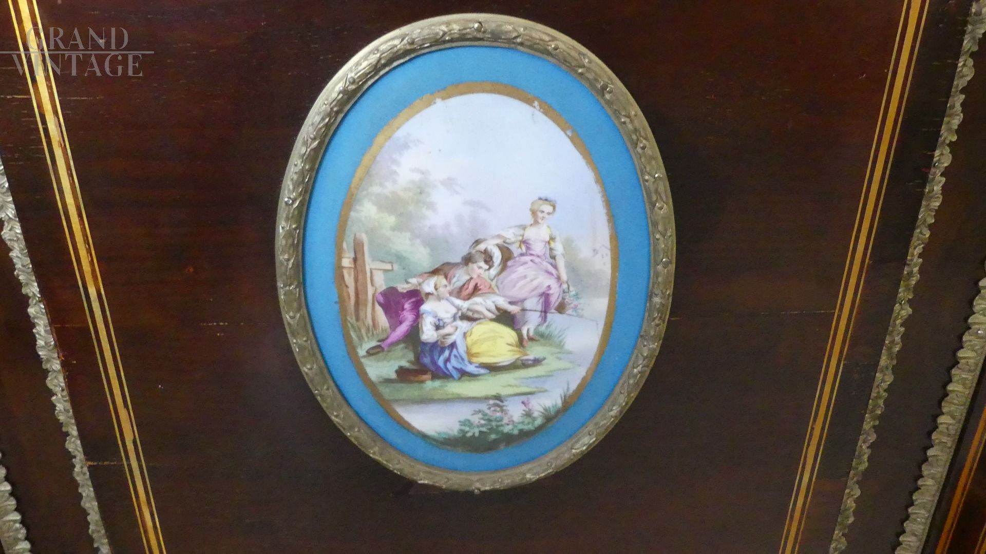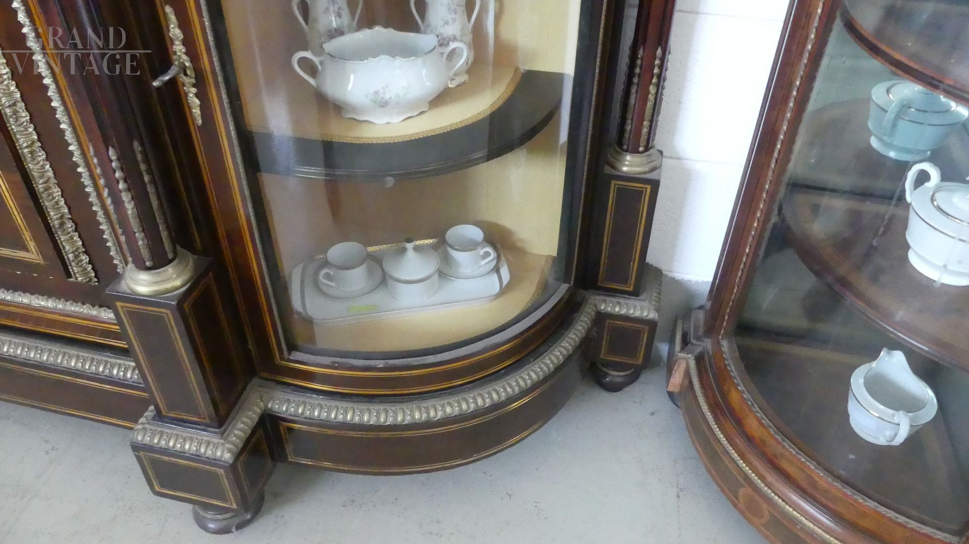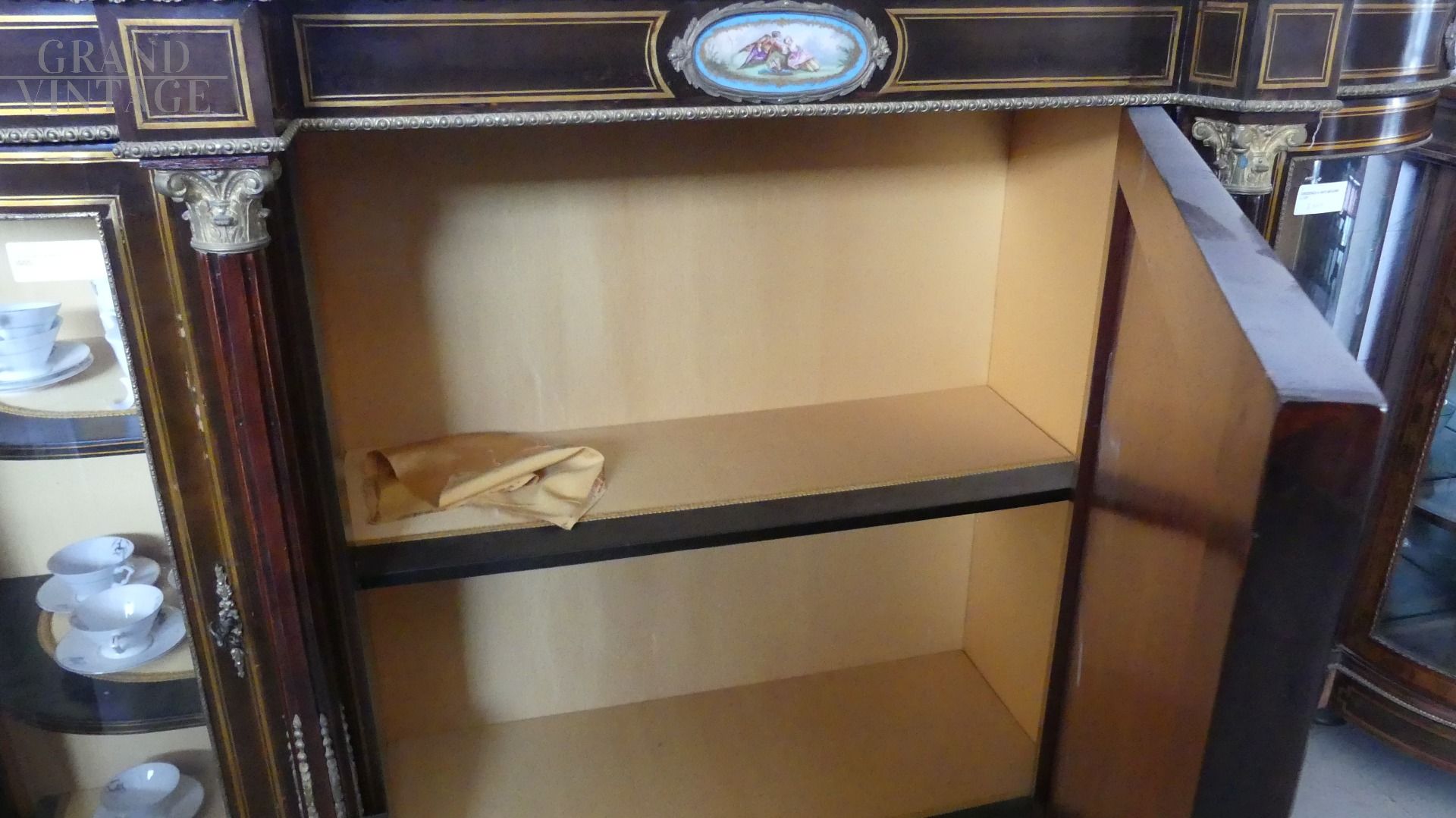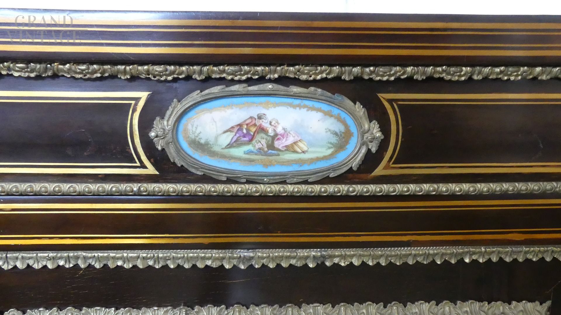 Bellissima e imponente credenza vetrina Boulle antica dell'inizio dell'800, in legno di mogano, intarsiata e filettata con legni vari, con fantastici ovali in ceramica Villeroy & Boch dipinti a mano e completa di cornici e fregi in ottone.