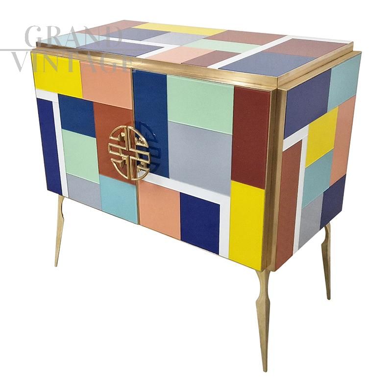 Credenza design a due ante con ripiano interno, interamente realizzata a mano, con struttura in legno rivestita in vetro colorato. Profili, maniglie e piedi in ottone dorato.