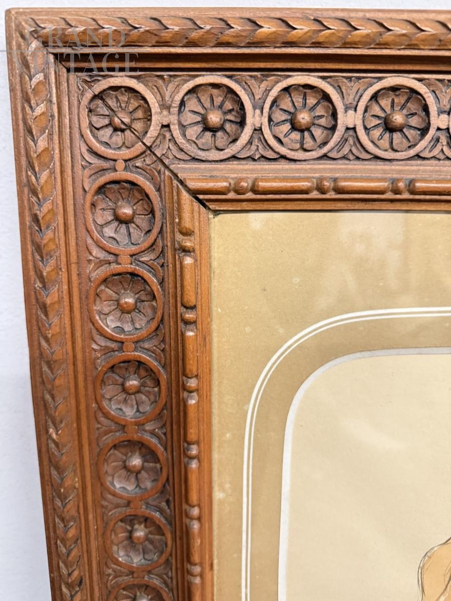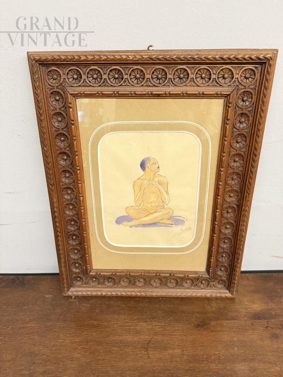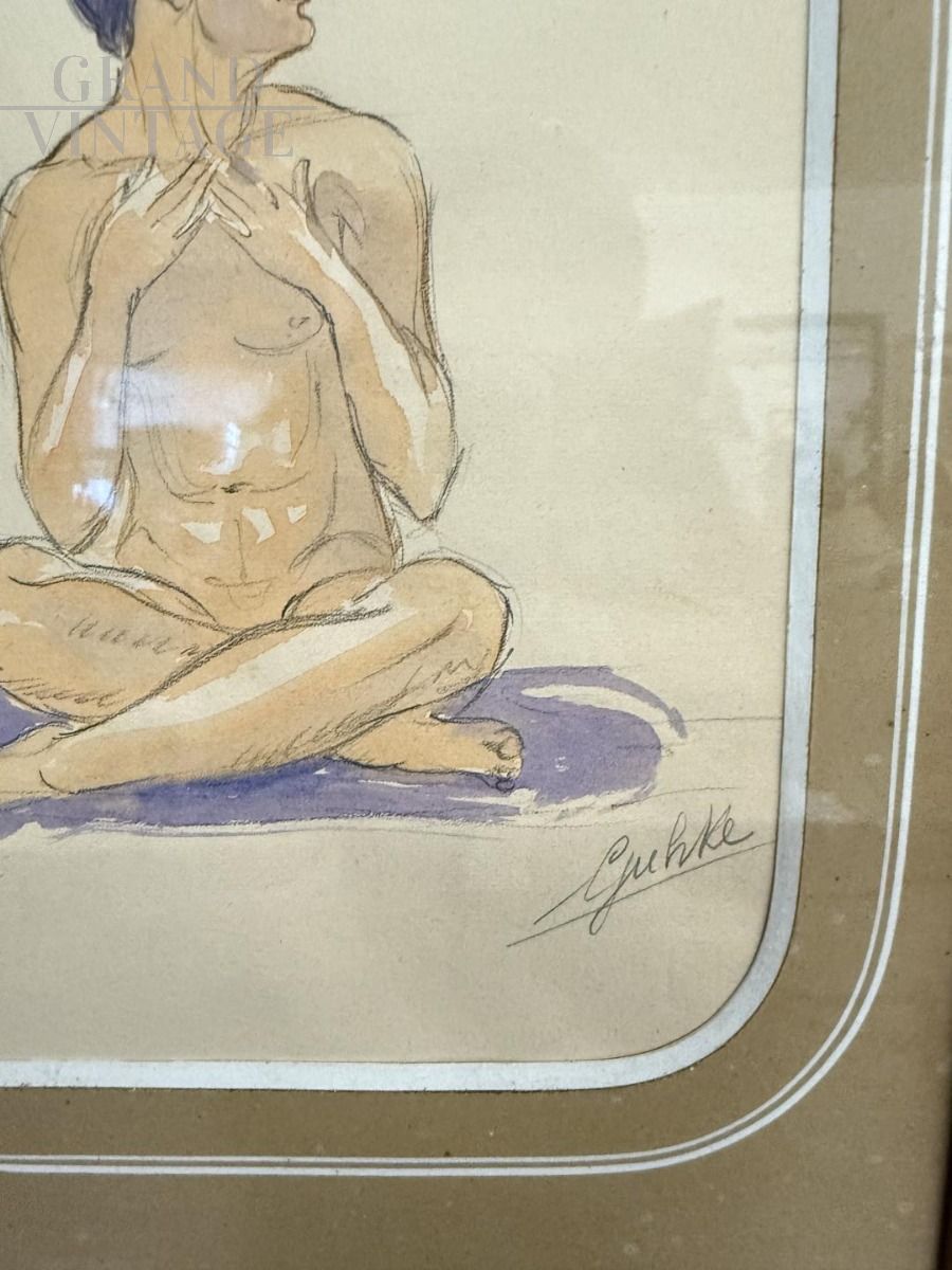 Dipinto ad acquerello firmato Guhke raffigurante una figura femminile nuda con le gambe incrociate, completo di cornice in noce intagliata, arte moderna, misure 57 x 44 cm. In ottimo stato.