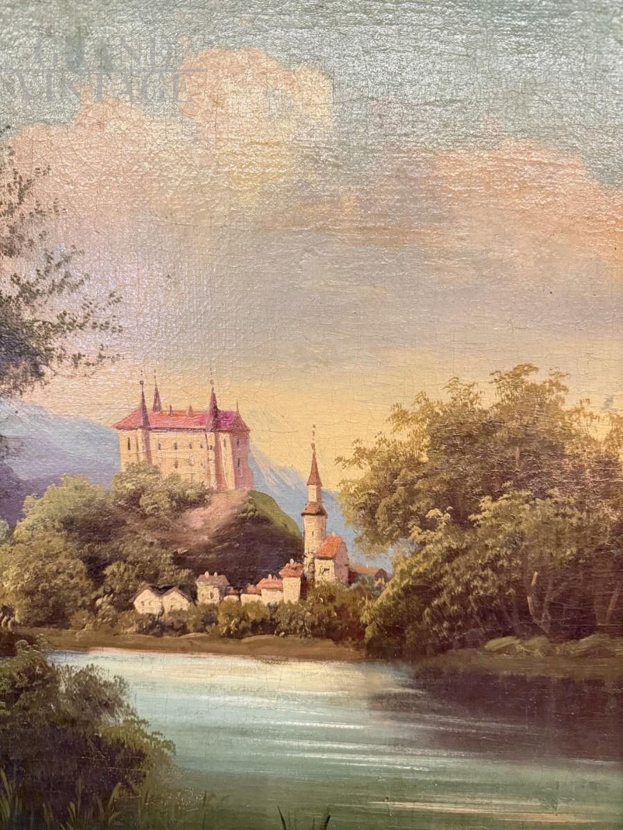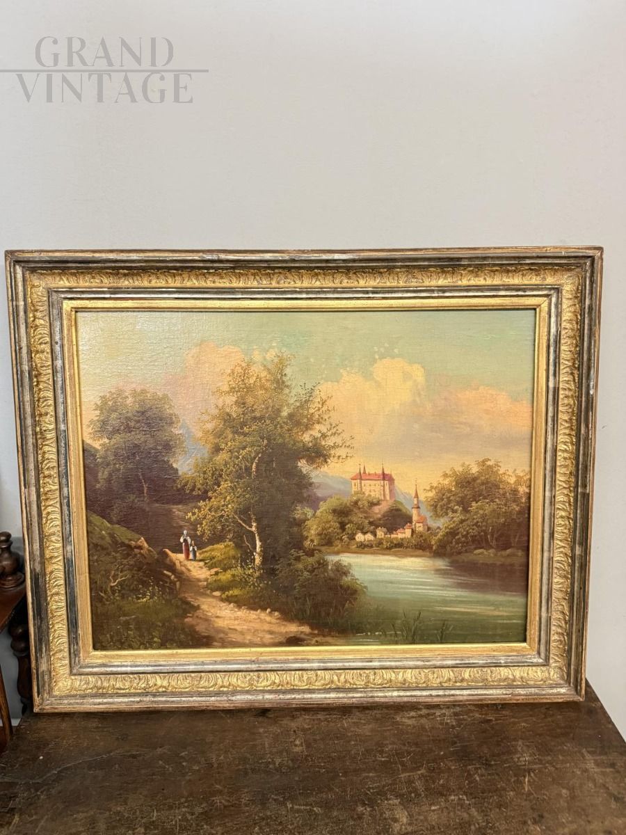 Dipinto antico olio su tela di scuola austriaca raffigurante un paesaggio fluviale con sentiero, castello e figure, XIX secolo, 67 x 78 cm.