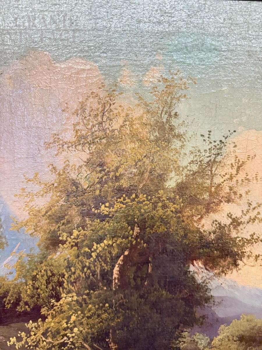 Dipinto antico di scuola austriaca con paesaggio fluviale, olio su tela del XIX secolo