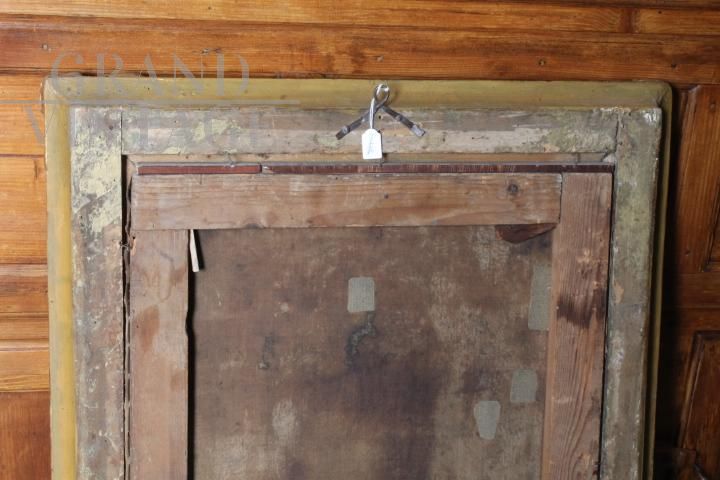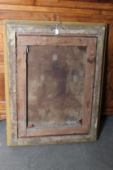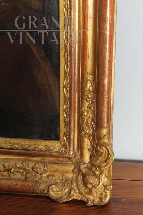 Dipinto antico olio su tela con Falconiere, in cornice a foglia oro