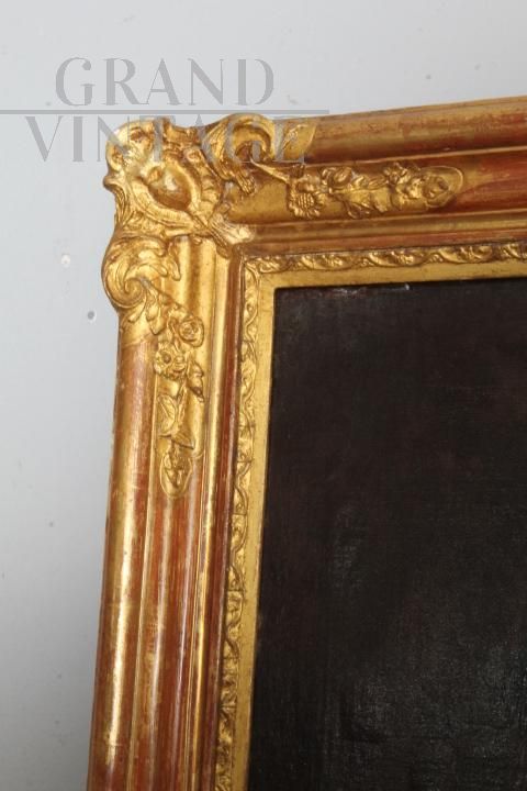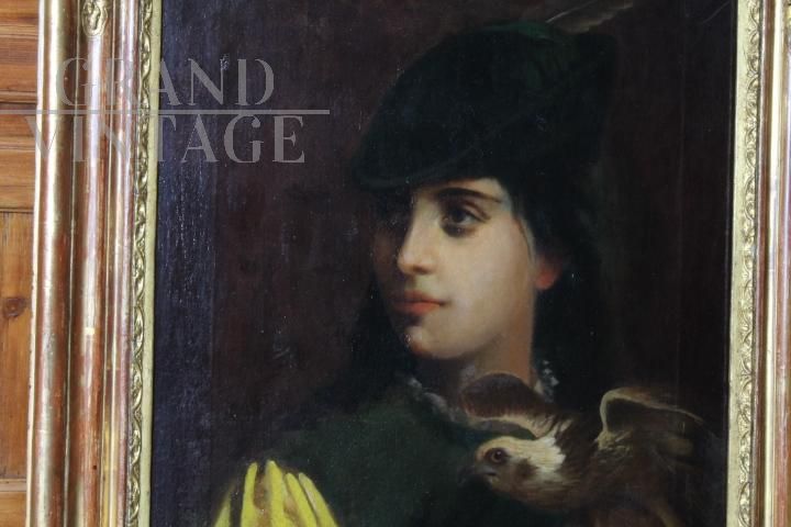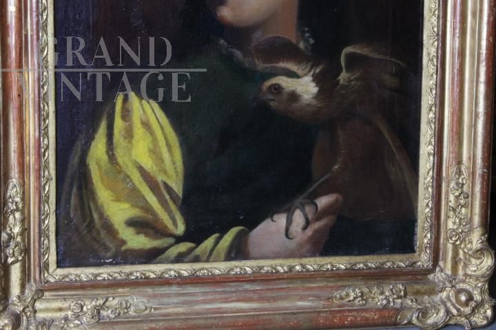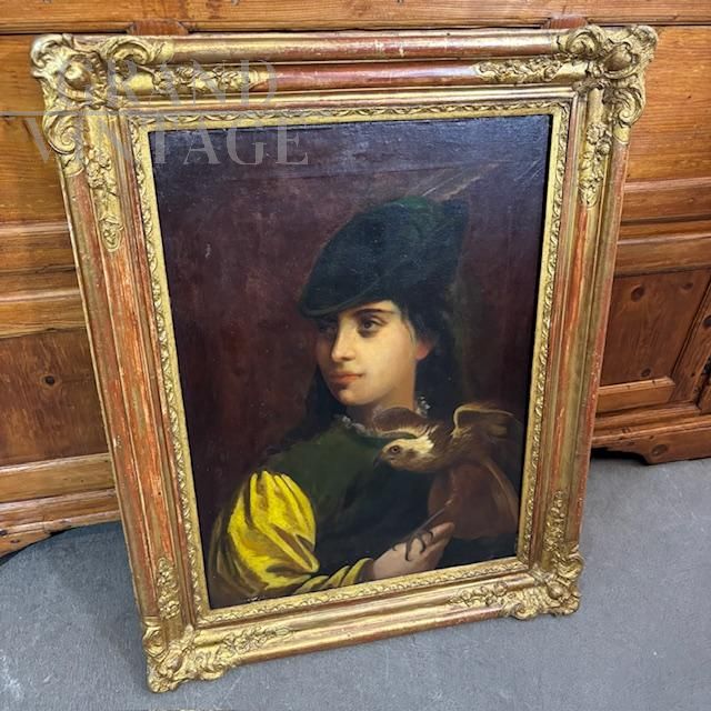 Antico dipinto olio su tela dei primi dell'800 raffigurante un giovane ragazzo falconiere, di bellissima qualità, completo di cornice antica coeva rivestita con foglia oro. In stato di conservazione molto buono.