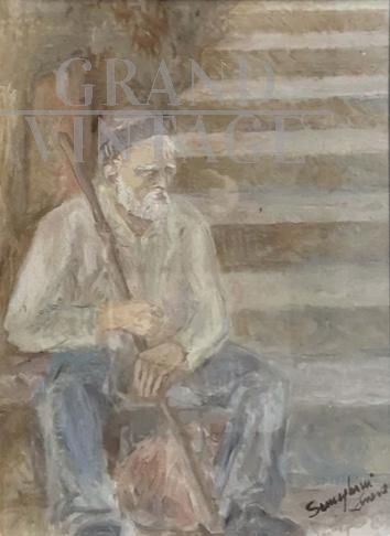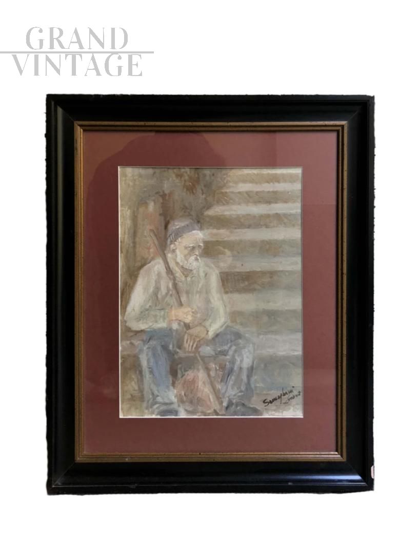 Dipinto olio su tela di Lucio Semeghini degli anni '30 raffigurante uomo anziano con bastone, misure: 60 x 50 cm.