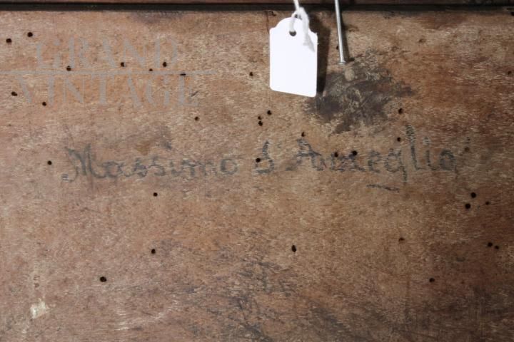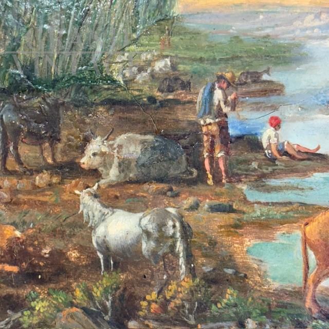 Dipinto antico olio su tavola di fine '700 raffigurante una scena bucolica con paesaggio, personaggi e mucche al pascolo, firmato sul retro Massimo d'Azeglio, completo di cornice antica dorata. Bellissima la qualità pittorica, realizzato su tavola di noce, in buono stato.