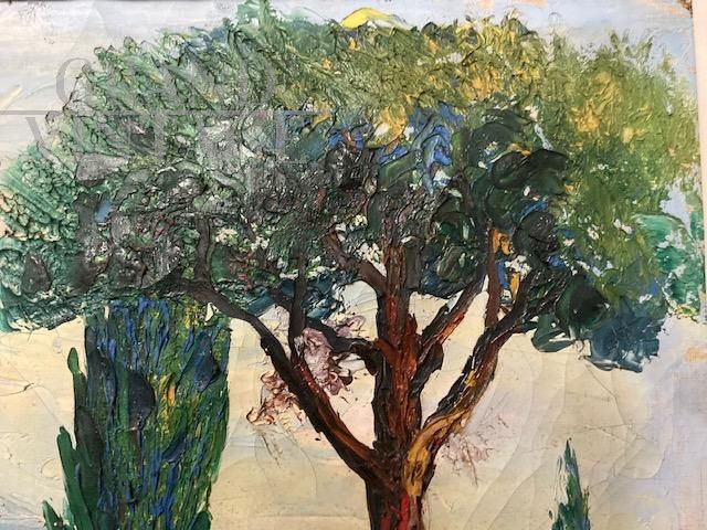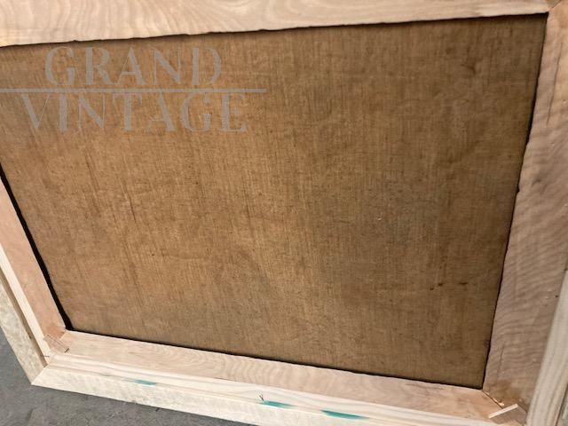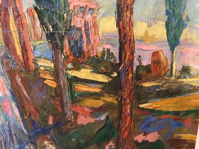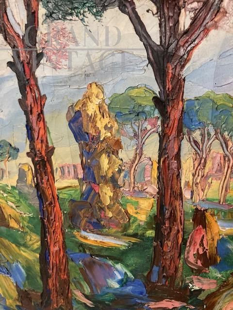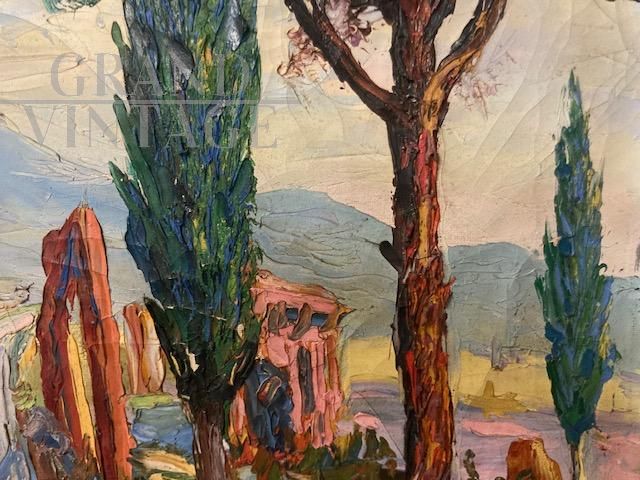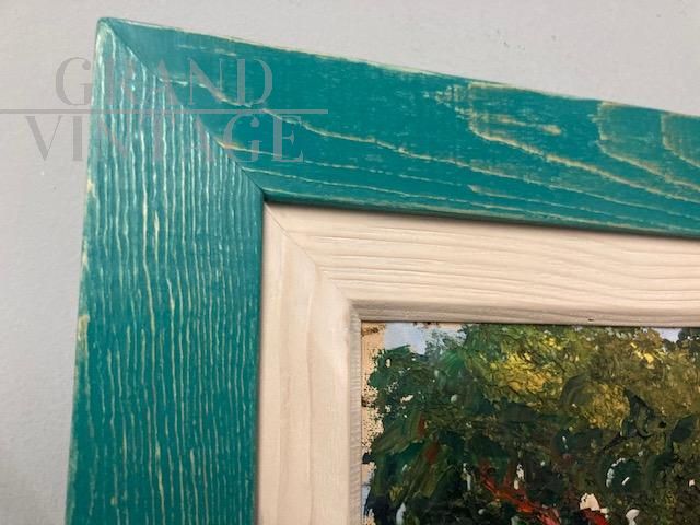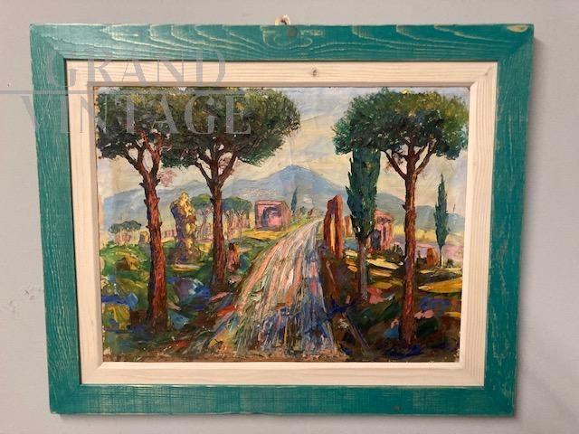 Antico splendido dipinto con viale alberato e con montagne di sfondo, olio su tela degli anni '40 con pennellate materiche. Bellissimo, molto colorato e vivace, completo di cornice laccata verde di epoca successiva. Ottimo stato.