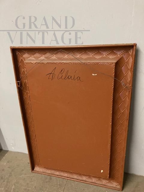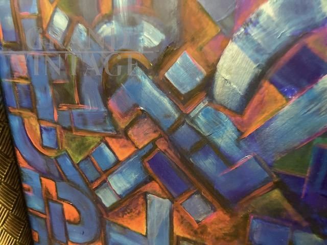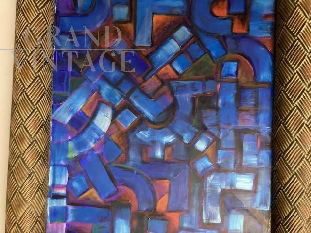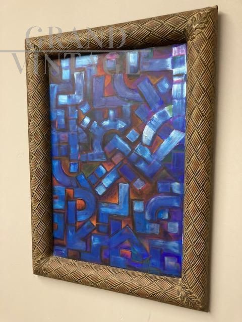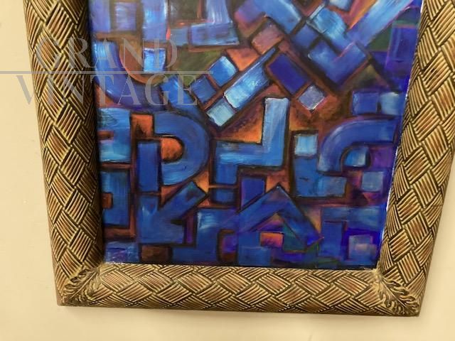 Dipinto di arte contemporanea con geometrie realizzato a smalti policromi su metallo, con fondo nelle tonalità del rosso e del viola e poi in scale di blu. Cornice bellissima intagliata in metallo. Artista del XXI secolo, opera firmata sul retro.