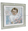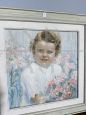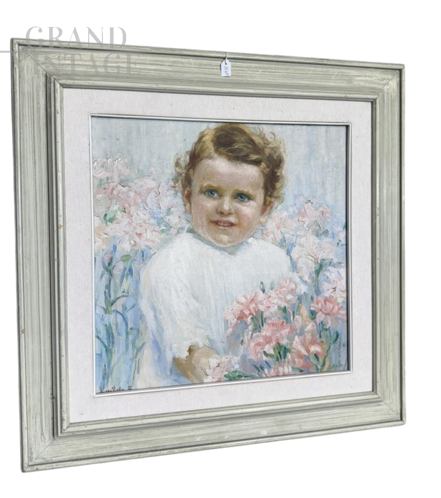 Dipinto olio su tela di gusto Liberty raffigurante il ritratto di una bambina con fiori, firmato, in ottimo stato, completo di cornice di epoca successiva con dimensioni 75 x 73 cm, dimensioni solo tela 57 x 50 cm.